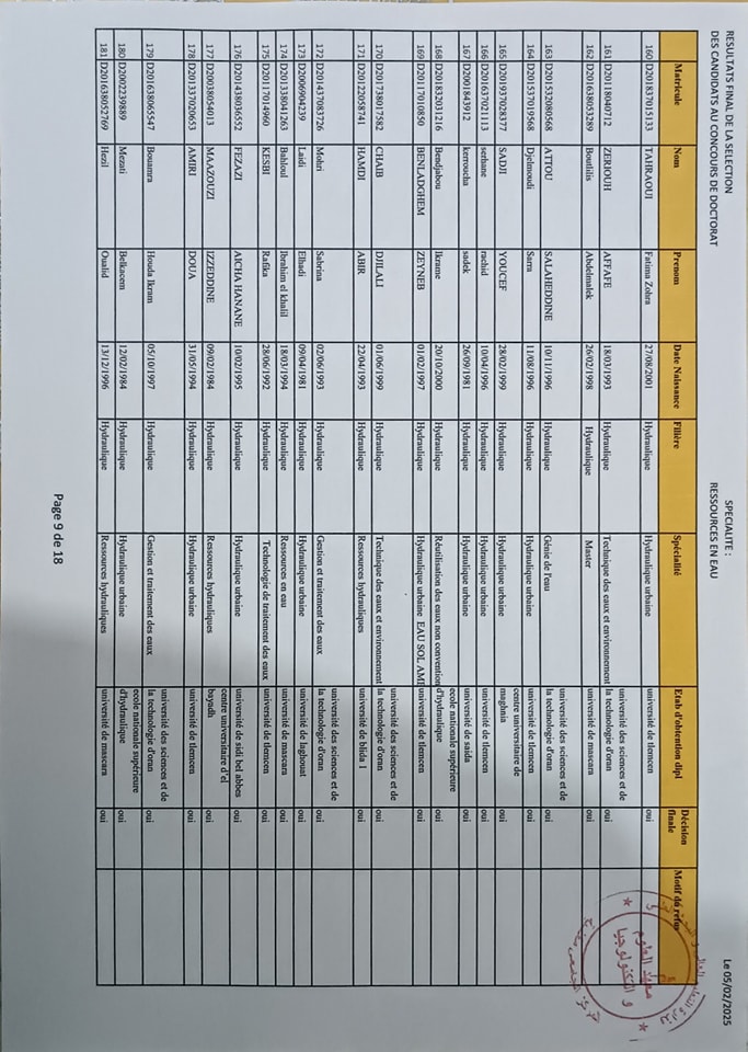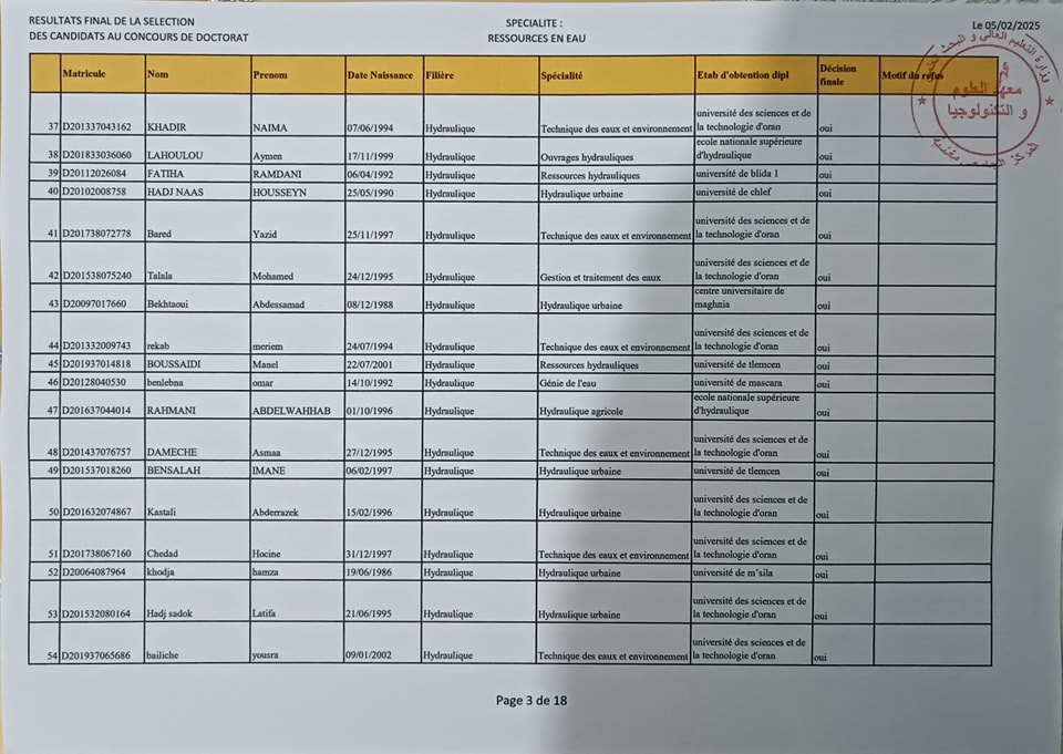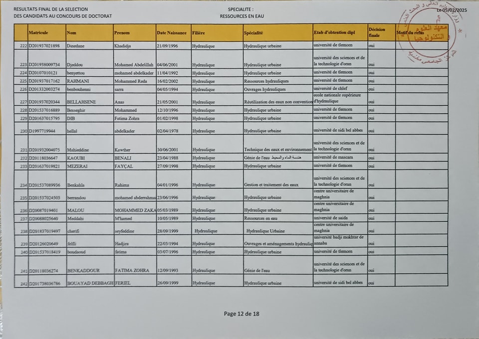 5 فبراير 2025 القوائم النهائية للمترشحين المقبولين لاجتياز مسابقة الدكتوراه شعبة الري بالمركز الجامعي مغنية بعنوان السنة الجامعية 2024-2025