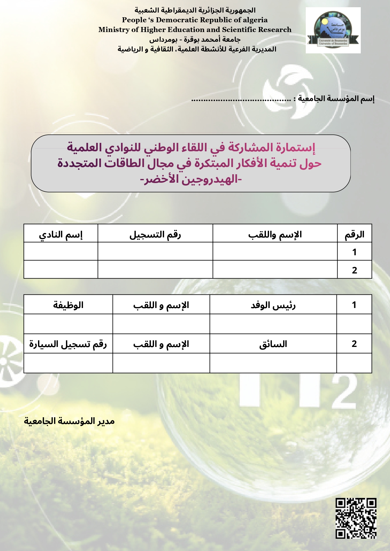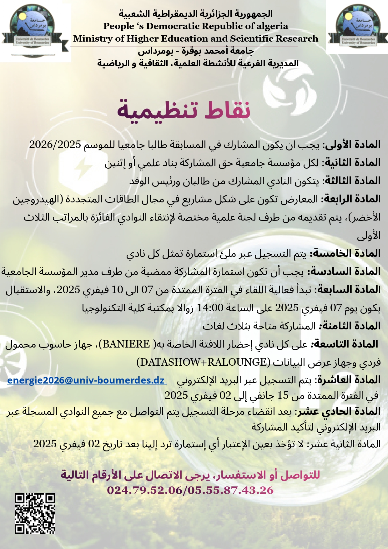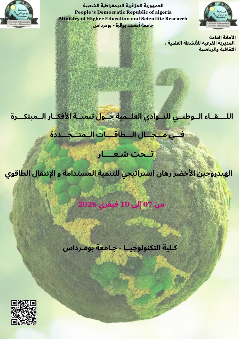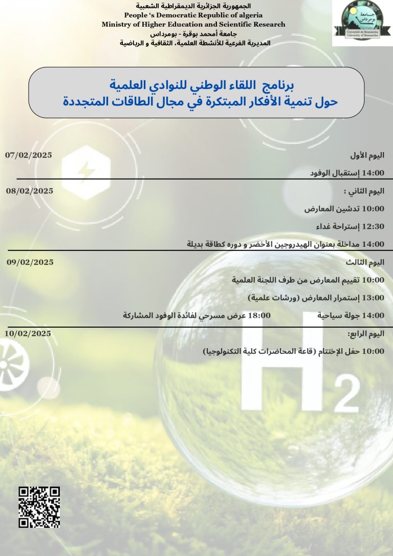 تجسيدا للبرنامج السنوي (2025-2026)، المتعلق بالأنشطة العلمية والثقافية والرياضية، الذي سطرته مديرية الحياة الطلابية بالتنسيق مع الديوان الوطني للخدمات الجامعية ، يشرفني إعلامكم بتنظيم اللقاء الوطني للنوادي العلمية حول تنمية الأفكار المبتكرة في مجال الطاقات المتجددة ،والذي تنظمه #جامعة بومرداس ، في الفترة الممتدة من 07 إلى 10 فيفيري 2026.