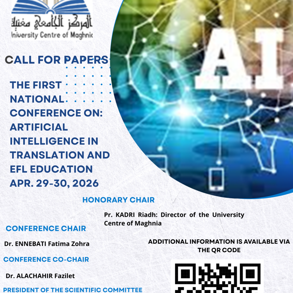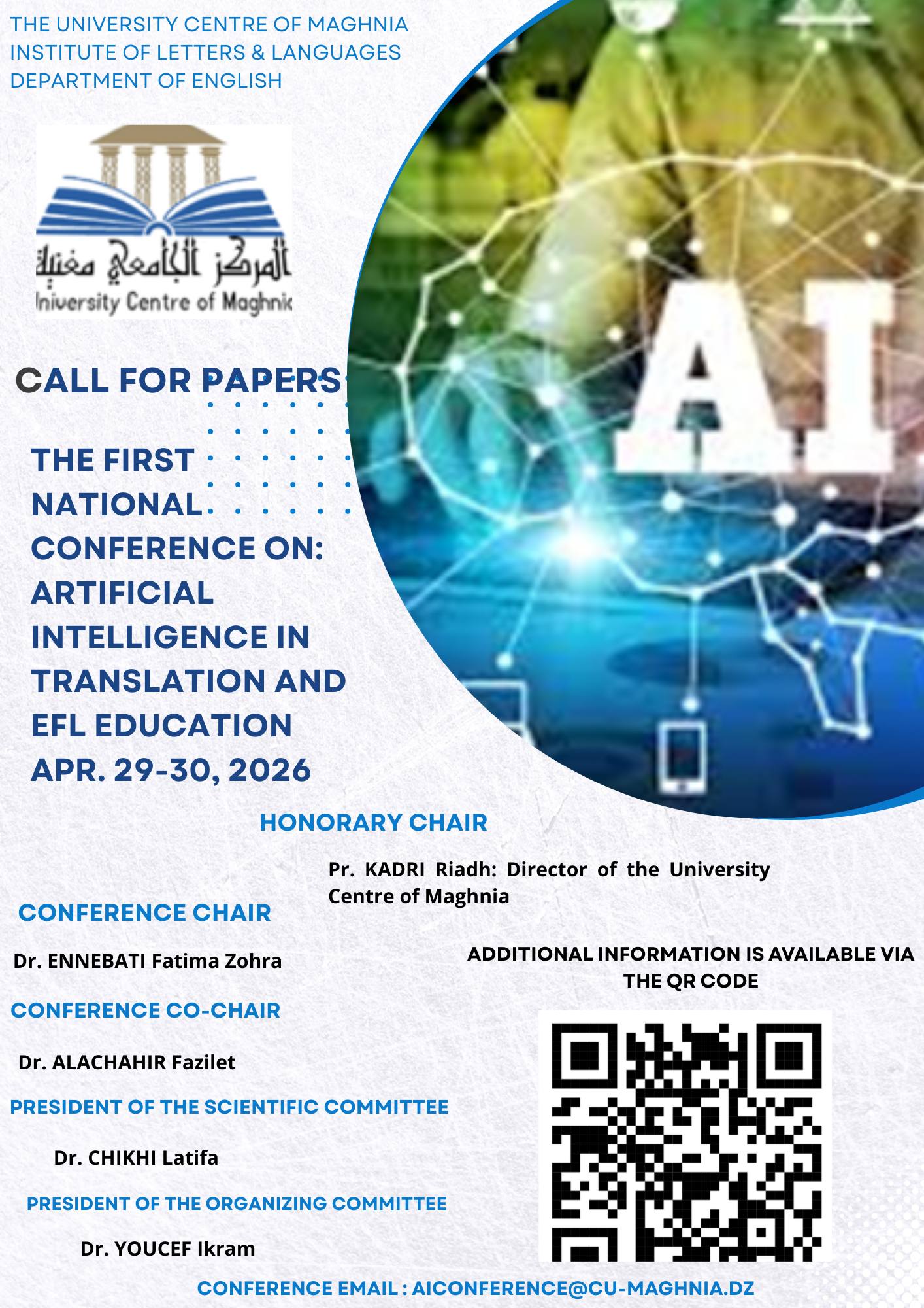 يسر المركز الجامعي مغنية، ممثلاً في معهد الآداب واللغات – قسم اللغة الإنجليزية، الإعلان عن تنظيم: الملتقى الوطني الأول حول الذكاء الاصطناعي في الترجمة وتعليم اللغة الإنجليزية كلفظة أجنبية (EFL)