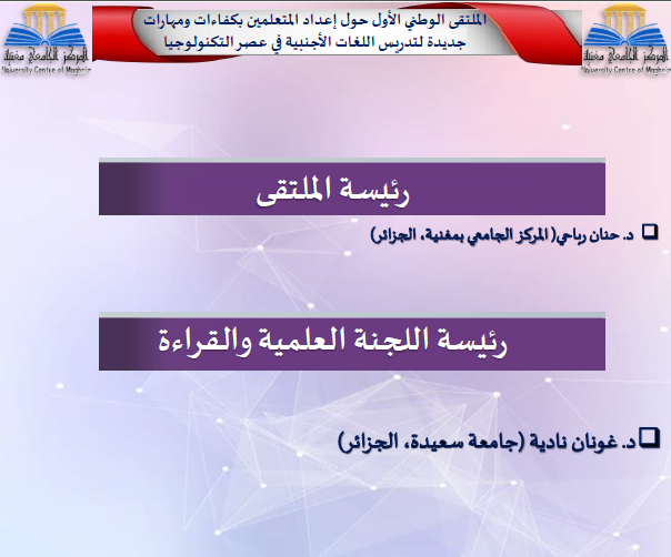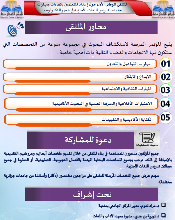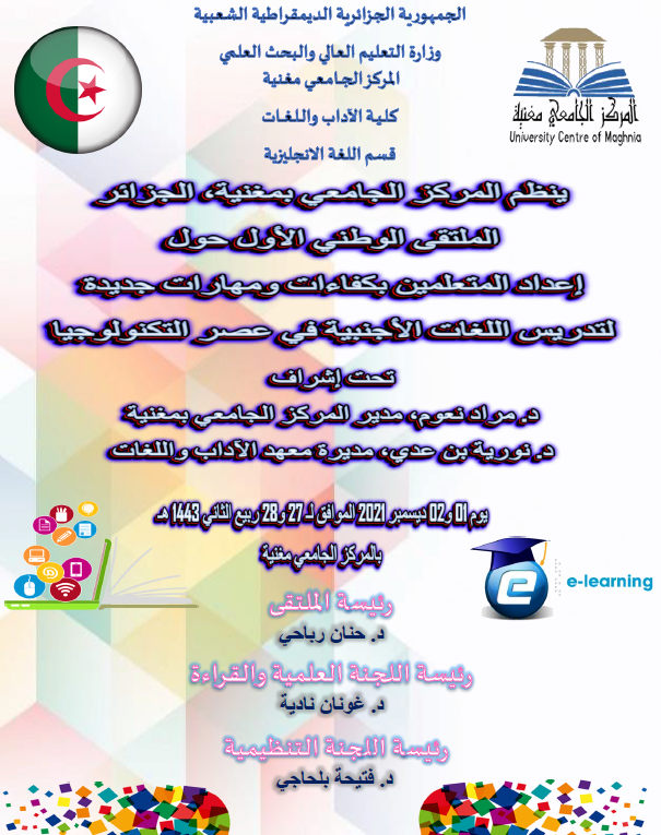الملتقى الوطني الأول الذي نظمه المركز الجامعي بمغنية، تحت إشراف قسم اللغة الإنجليزية بمعهد الآداب واللغات، تمحور حول “إعداد المتعلمين بكفاءات ومهارات جديدة لتدريس اللغات الأجنبية في عصر التكنولوجيا” .