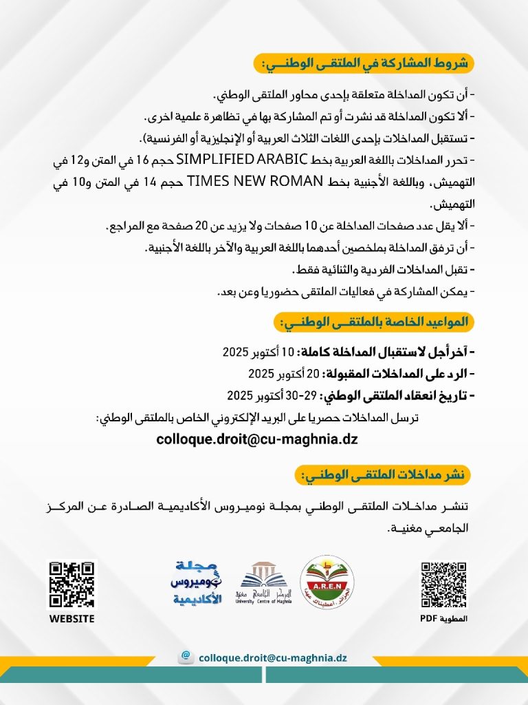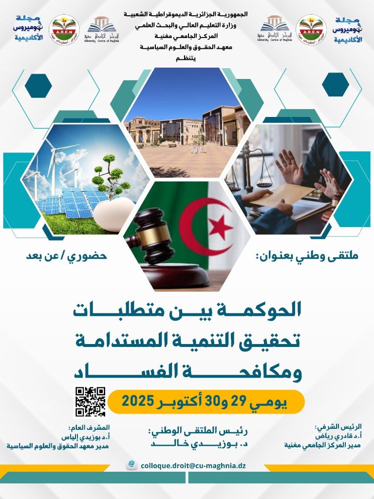 تشرف معهد الحقوق والعلوم السياسية المركز الجامعي مغنية دعوة الأساتذة والباحثين وطلبة الدكتوراه ومختلف الفاعلين للمشاركة في فعاليات الملتقى الوطني بعنوان: الحوكمة بين متطلبات تحقيق التنمية المستدامة ومكافحة الفساد، المزمع تنظيمه يومي 29 و30 أكتوبر 2025، وفق نمط حضوري وعن بعد، وفقا للشروط والآجال الموضحة في المطوية المرفقة.