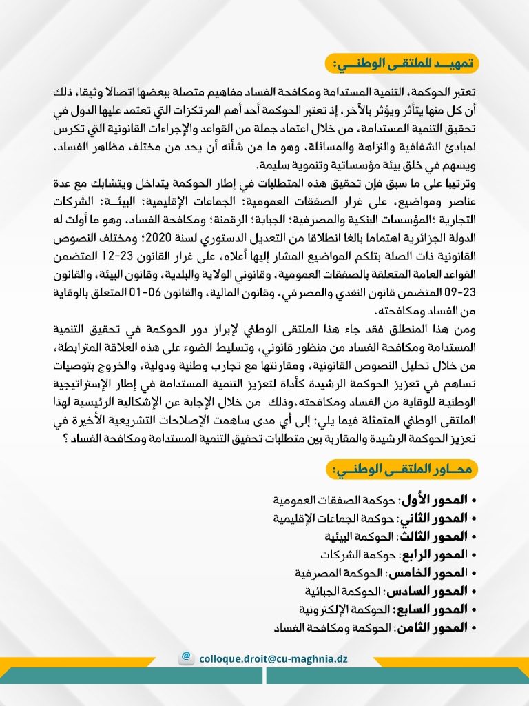 ملتقى وطني : الحوكمة بين متطلبات تحقيق التنمية المستدامة ومكافحة الفساد