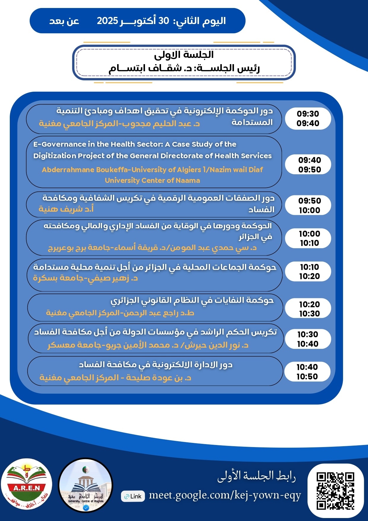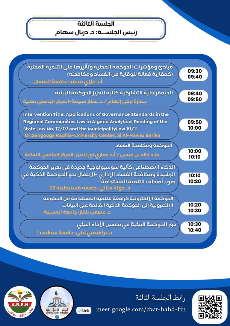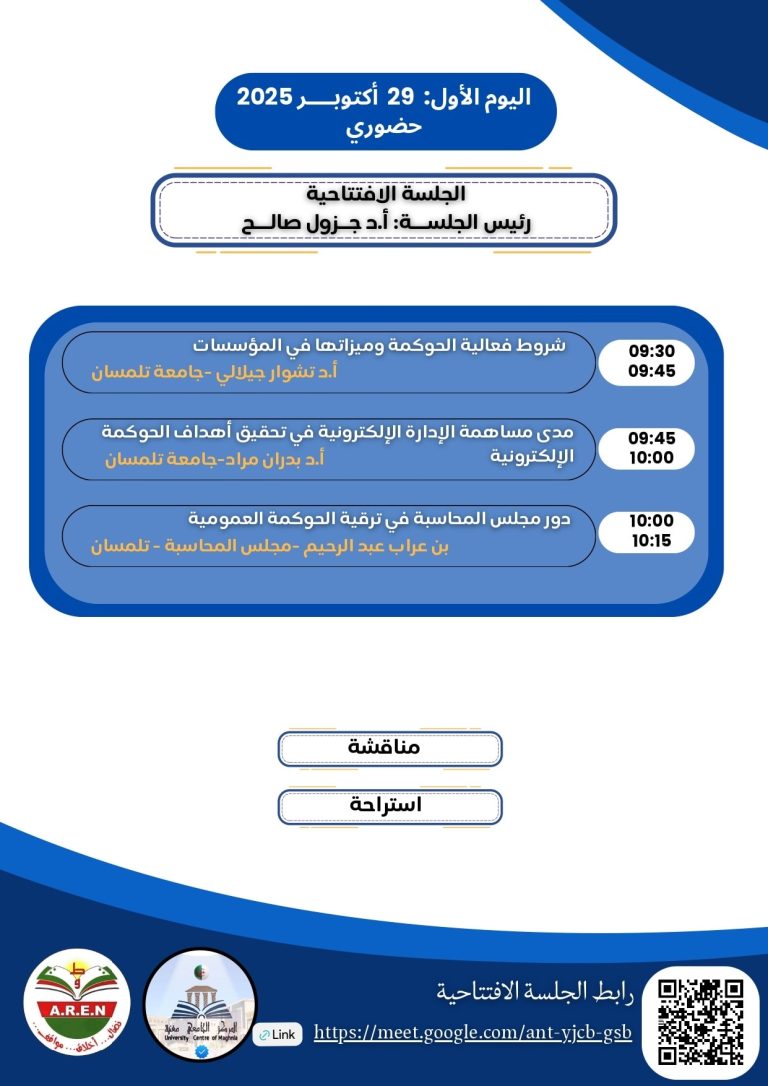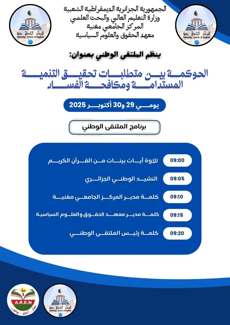 نظم معهد الحقوق والعلوم السياسية المركز الجامعي مغنية University Centre of Maghnia اليوم الأربعاء الموافق 29 أكتوبر 2025 فعاليات الملتقى الوطني “الحوكمة بين متطلبات تحقيق التنمية المستدامة ومكافحة الفساد”، برئاسة الدكتور بوزيدي خالد، وتحت إشراف البروفيسور قادري رياض مدير المركز الجامعي مغنية، وذلك بحضور ممثلين عن السلطات الأمنية وقطاع الجمارك، إضافة إلى حضور رئيس مجلس المحاسبة الغرفة الجهوية تلمسان، وأساتذة وباحثين من جامعة تلمسان والشلف، وفاعلين من قطاع وزارة المالية والجامعات المحلية، وبحضور ومشاركة أساتذة معهد الحقوق والعلوم السياسية، ومعهد العلوم الإقتصادية والتجارية وعلوم التسيير.