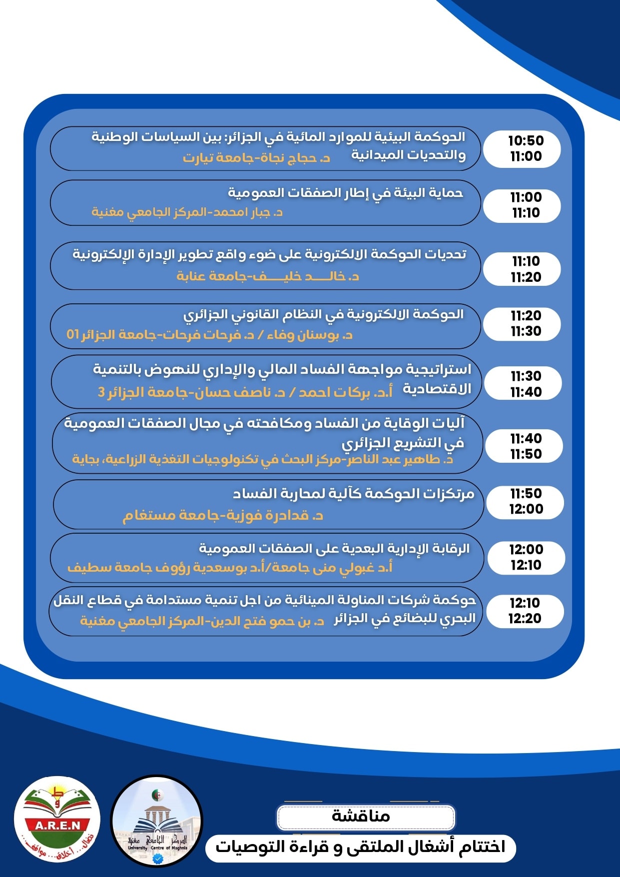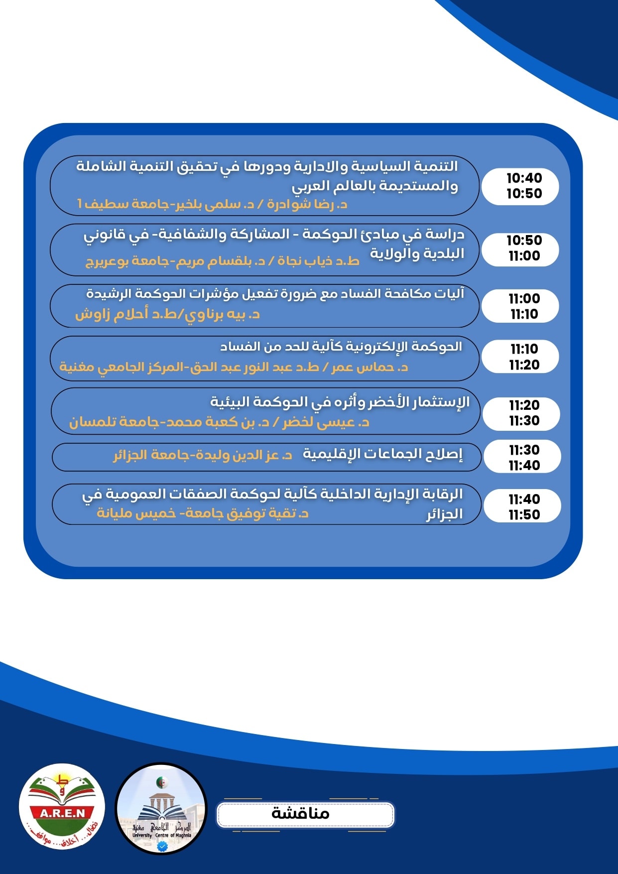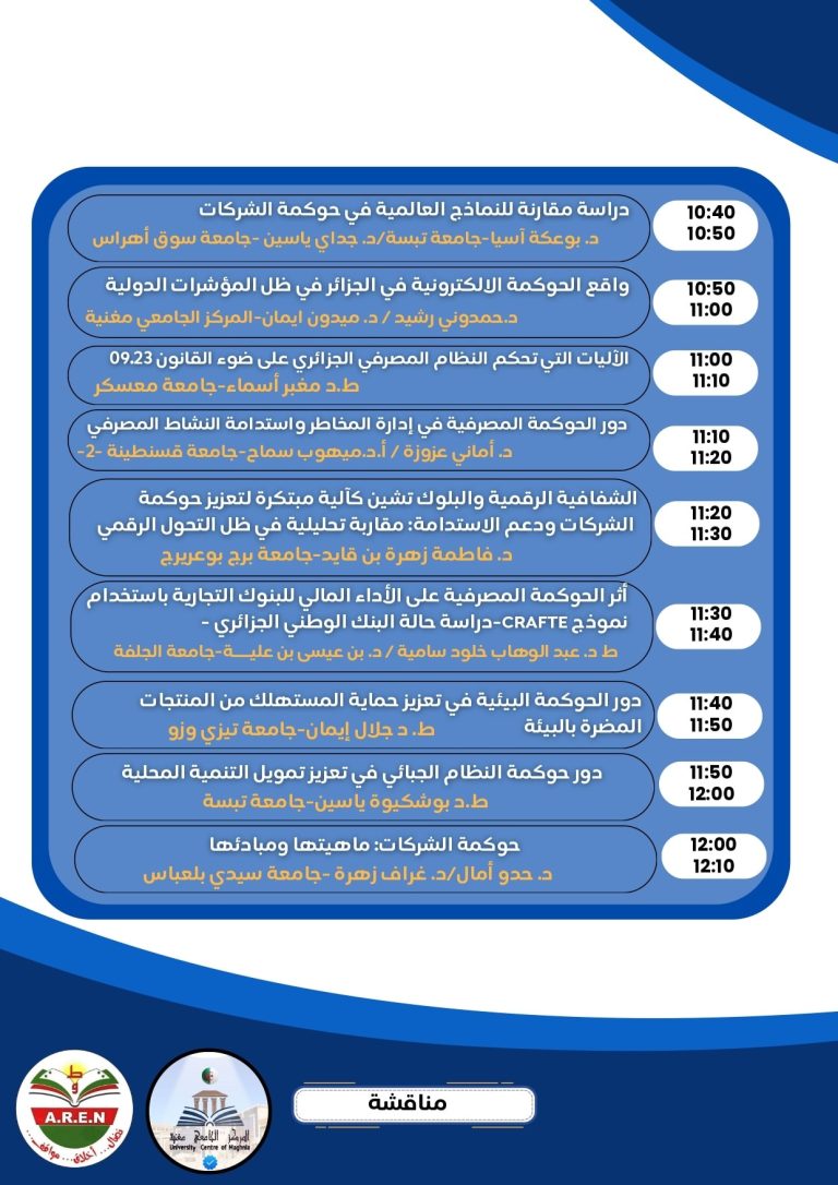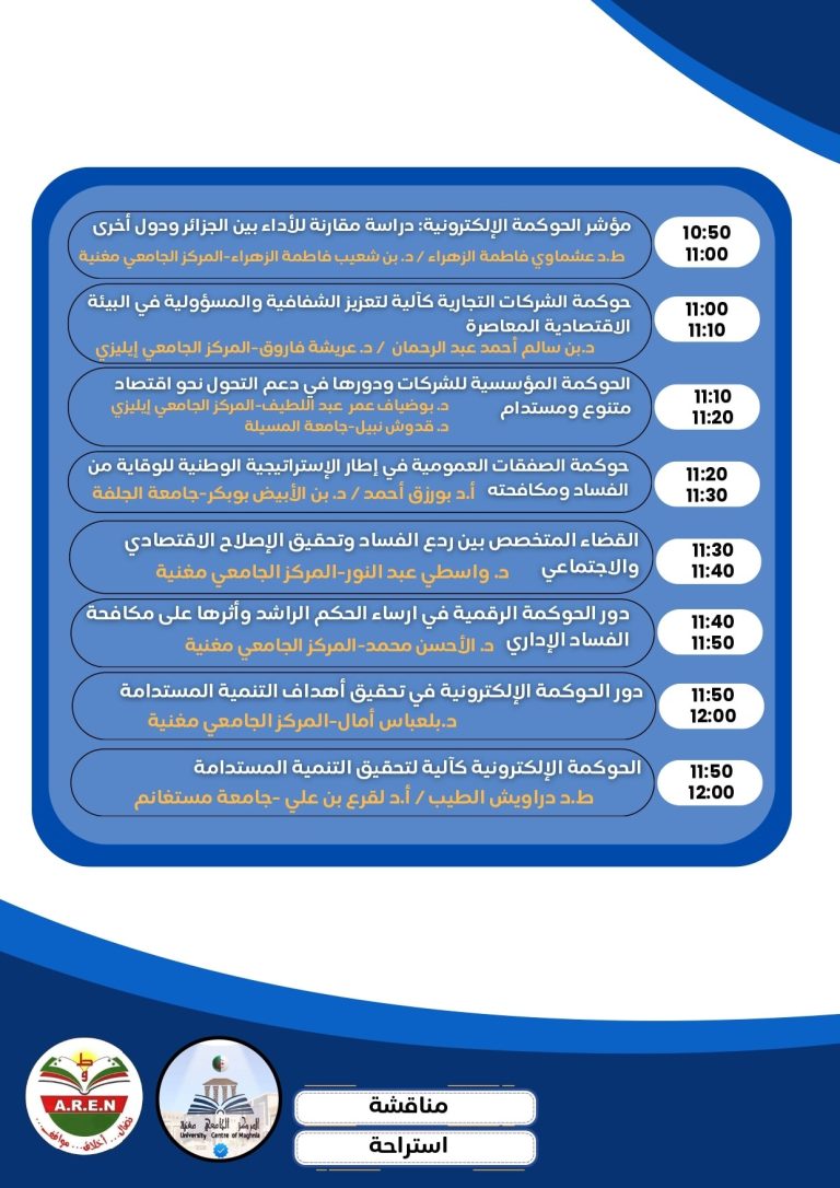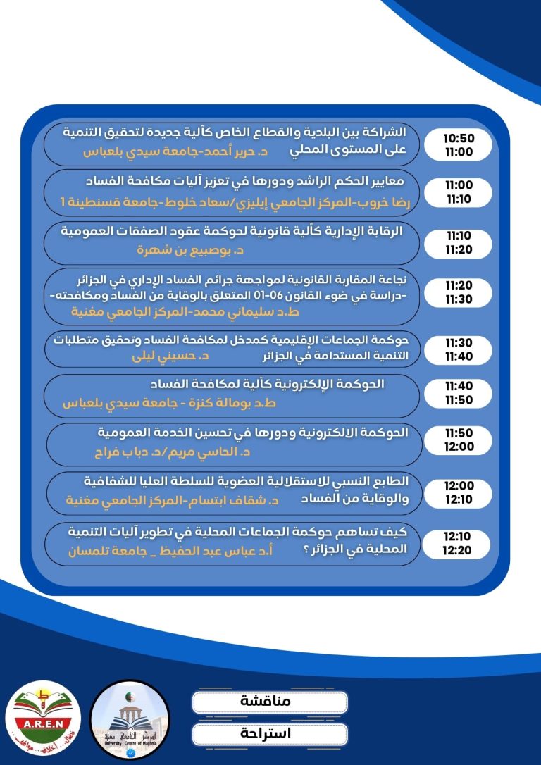 – ليفتح بعدها المجال للمناقشة، في جو علمي مميز وراق، تبادل من خلاله الحضور والأساتذة المتدخلين سبل ترسيخ وتكريس مبادئ الحكومة لتحقيق التنمية المستدامة المنشودة، ومكافحة الفساد.