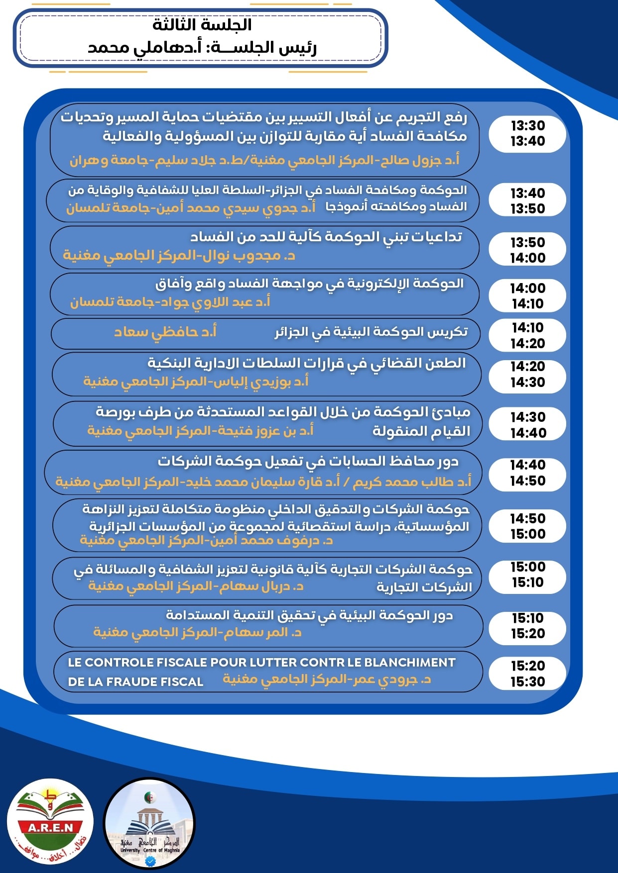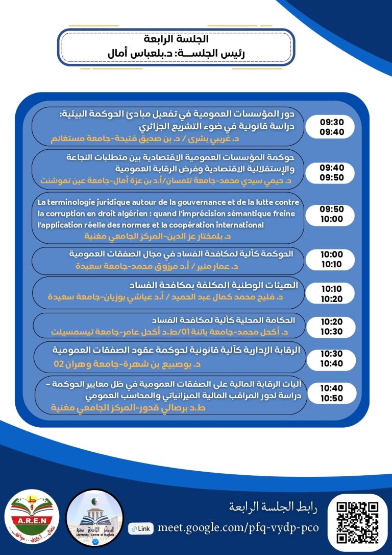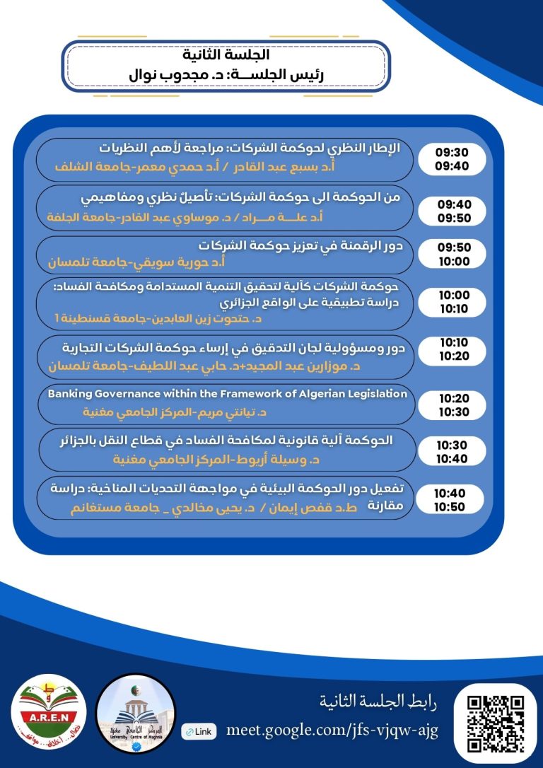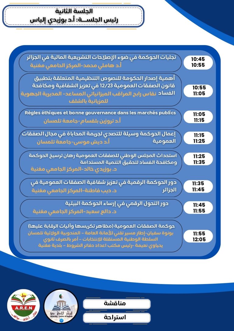 – أما الجلسة الثانية فقد ركزت بشكل أساسي على العلاقة بين التشريع المالي والصفقات العمومية وبين متطلبات الحوكمة ومكافحة الفساد.
