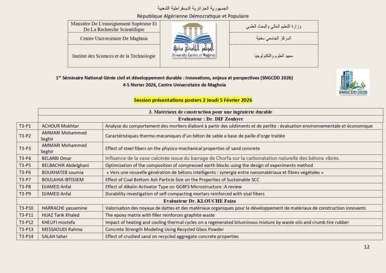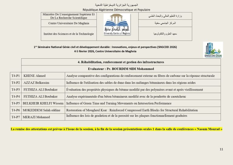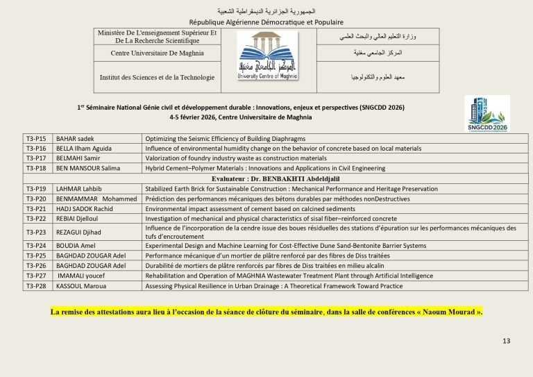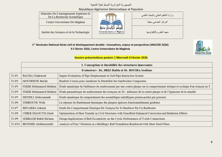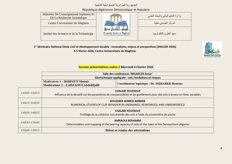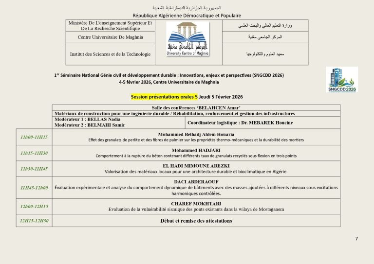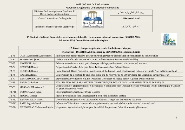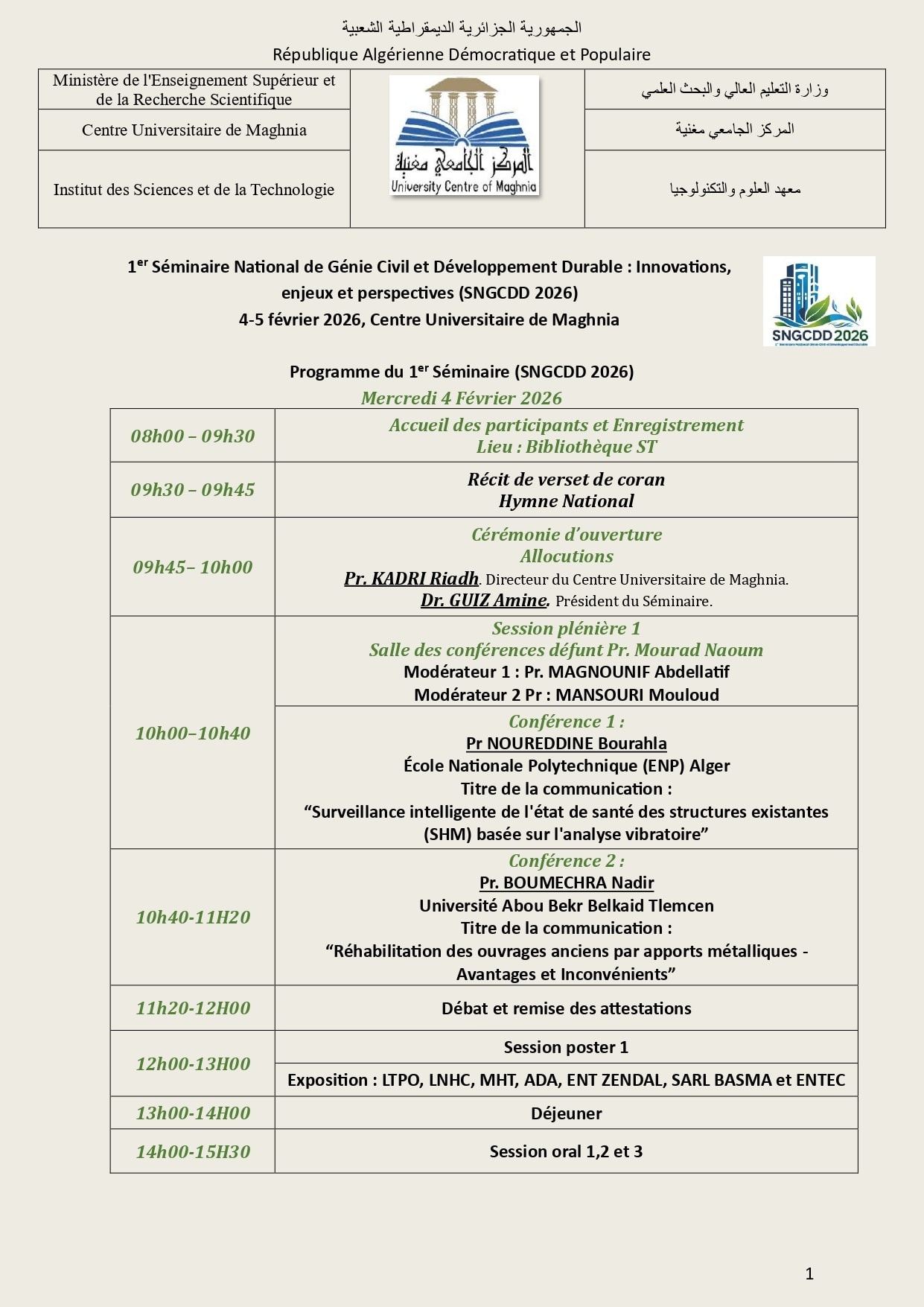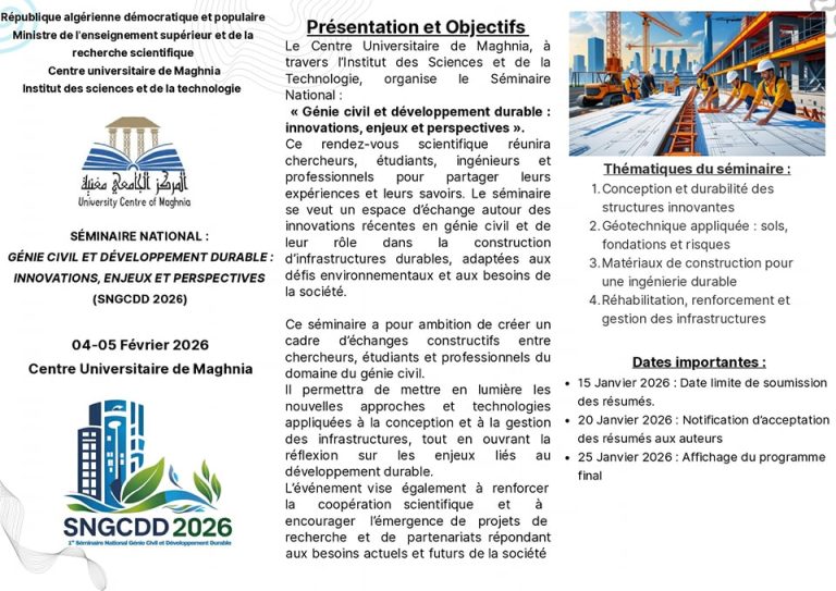 ملتقى وطني بعنوان الهندسة المدنية والتنمية المستدامة: ابتكارات، تحديات وآفاق (SNGCDD 2026) ، 4-5 فيفري 2026، المركز الجامعي بمغنية.