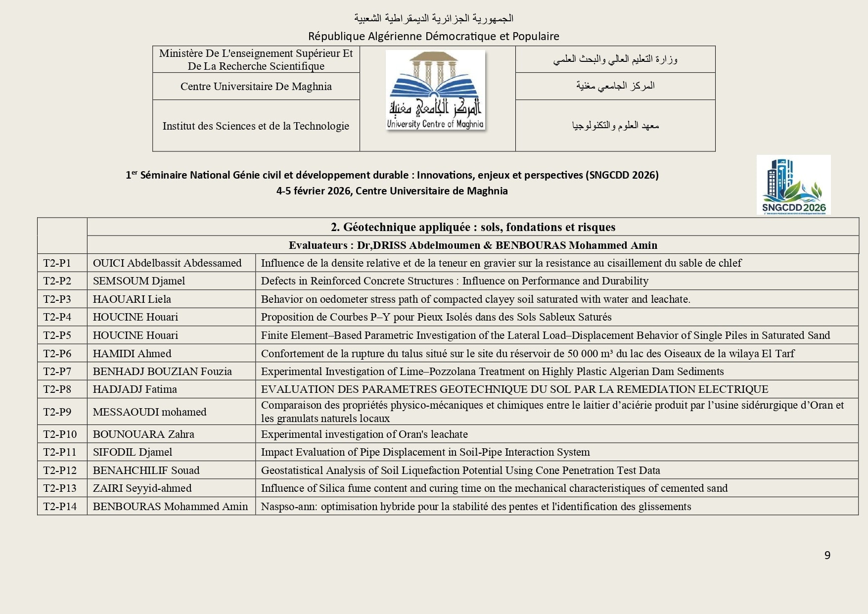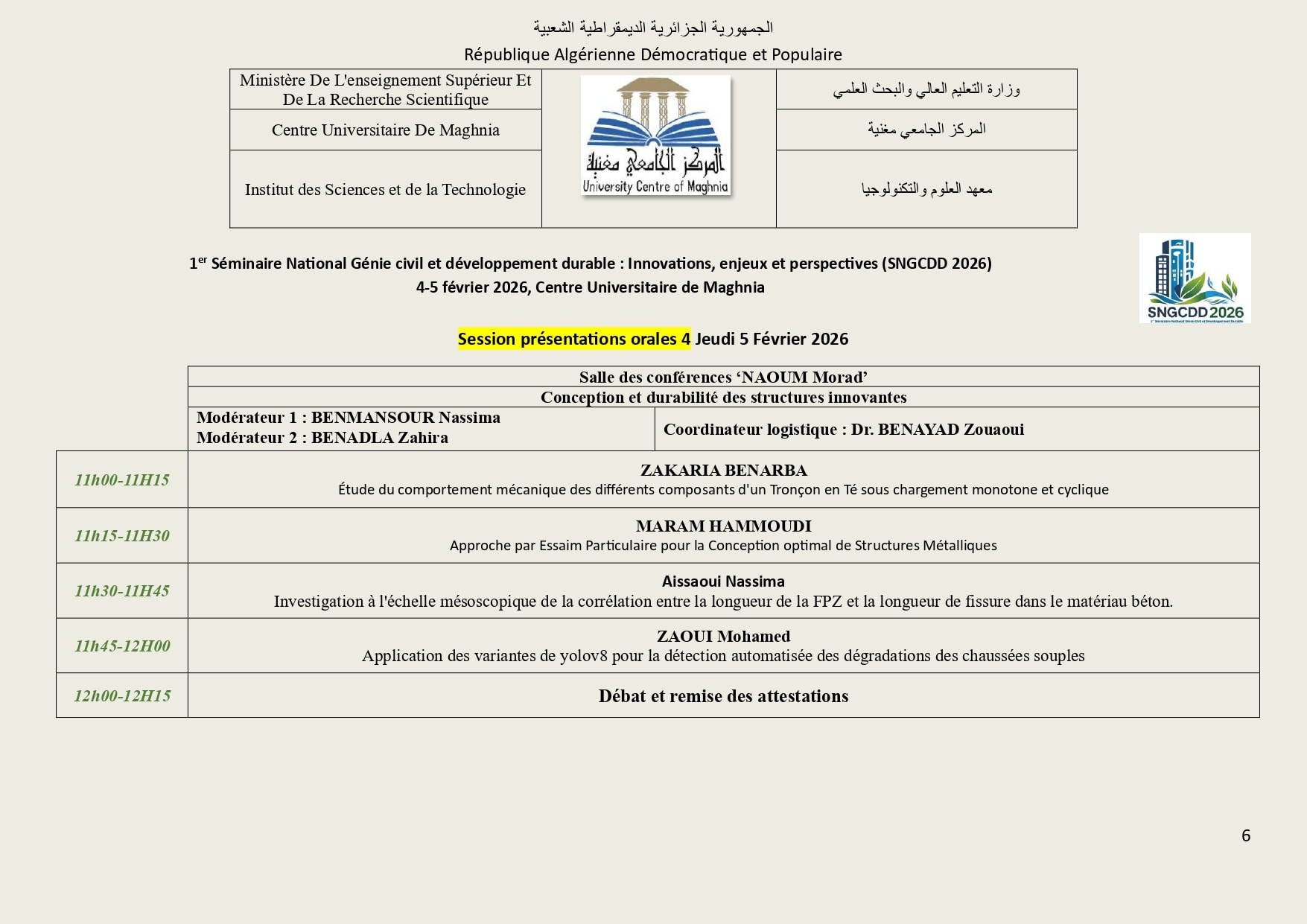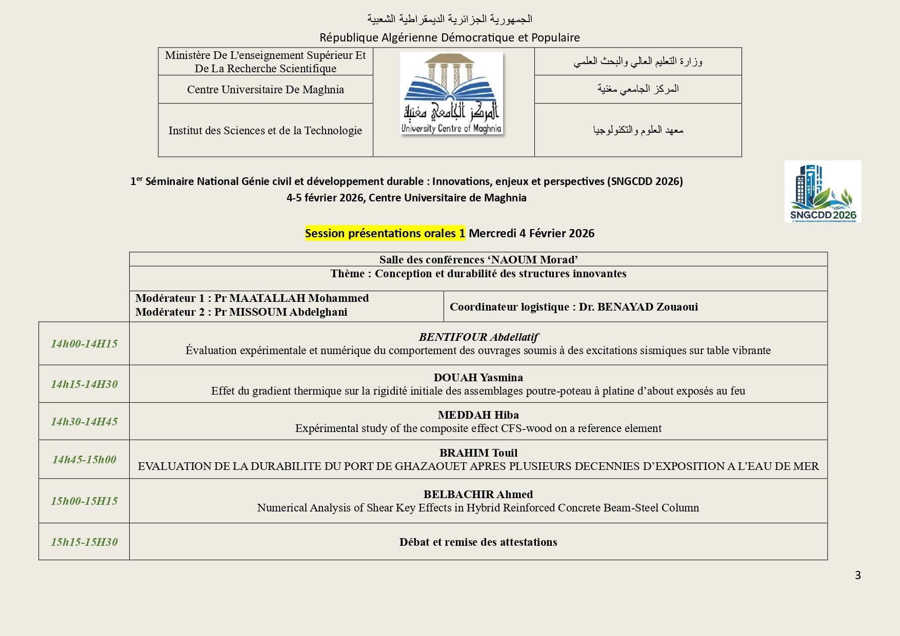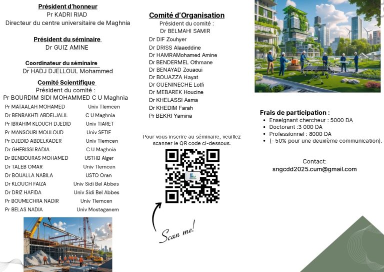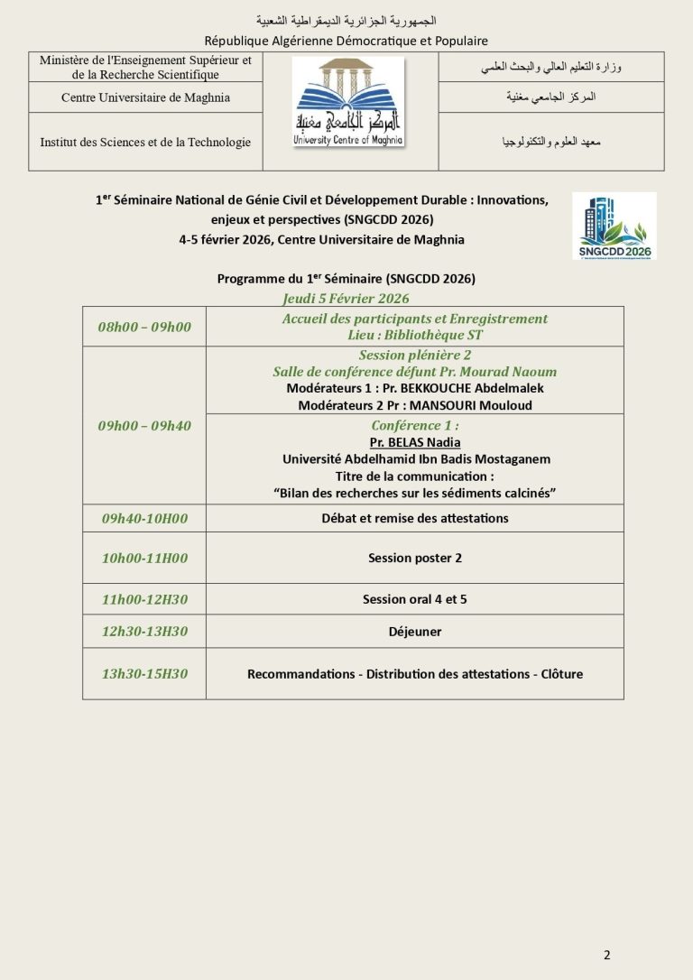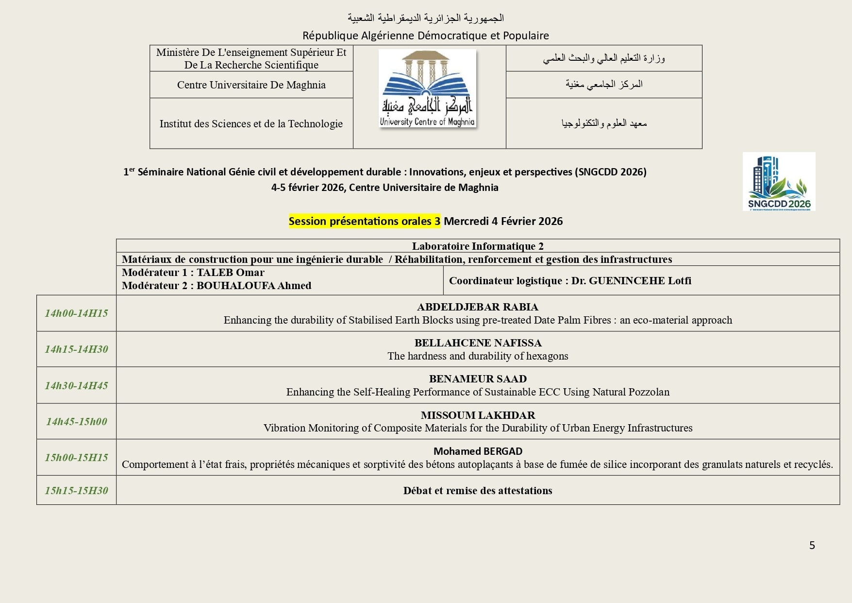 ملتقى وطني بعنوان الهندسة المدنية والتنمية المستدامة: ابتكارات، تحديات وآفاق (SNGCDD 2026) ، 4-5 فيفري 2026، المركز الجامعي بمغنية.