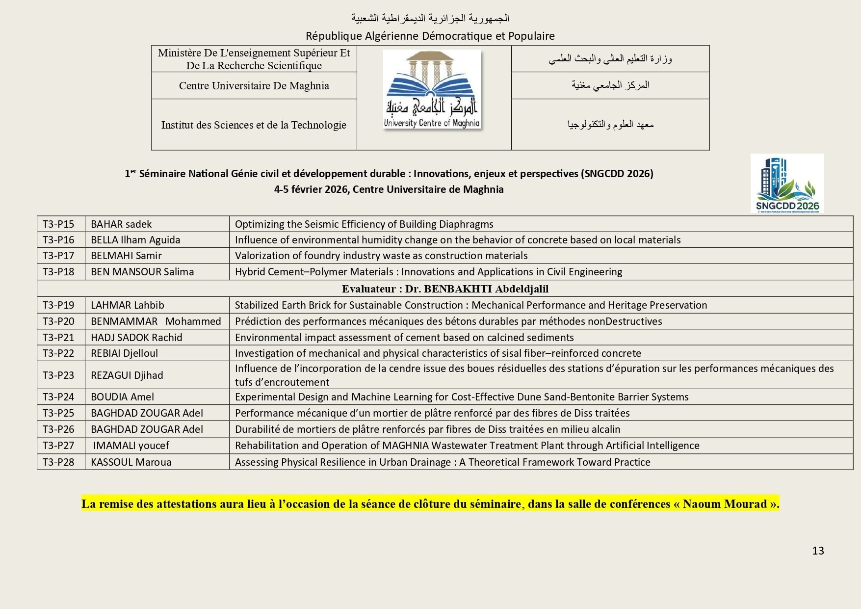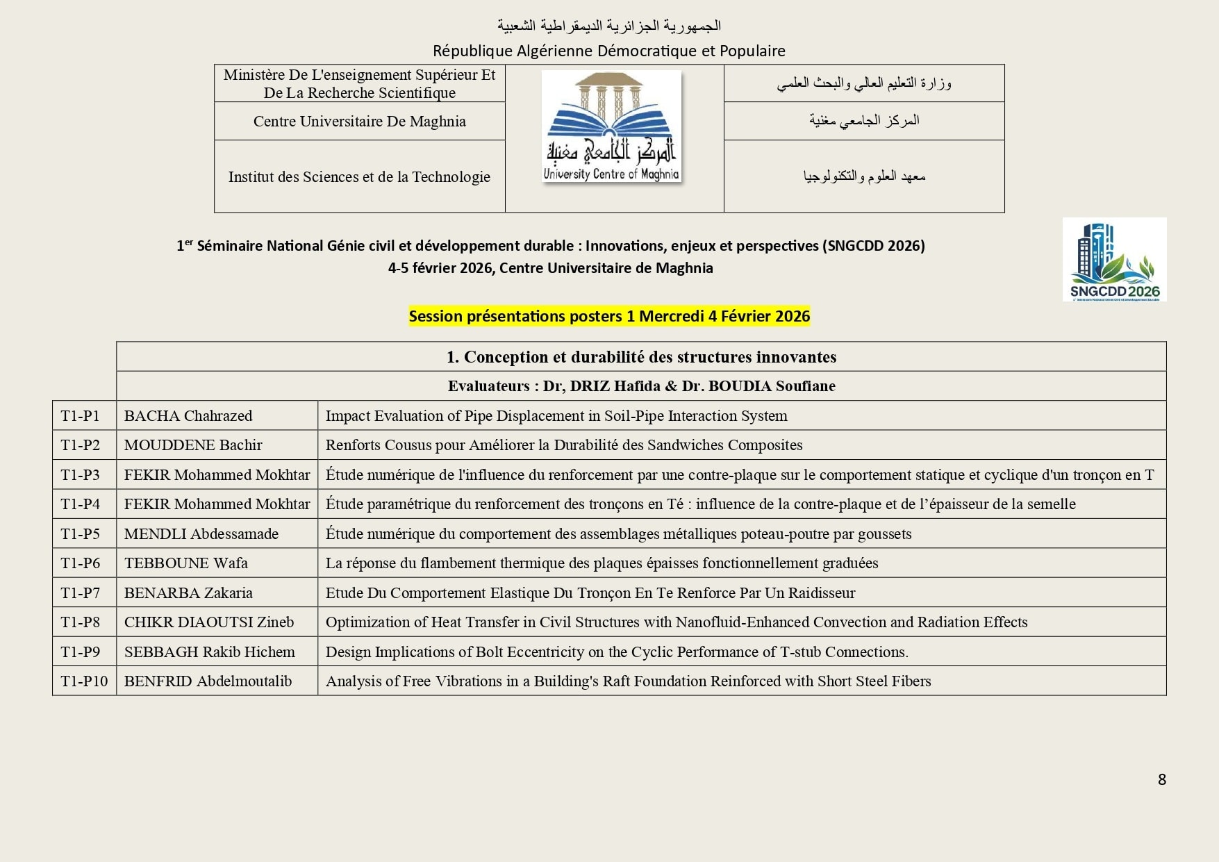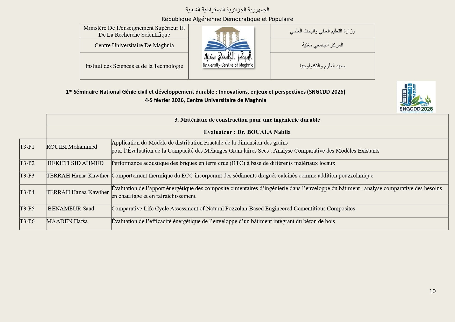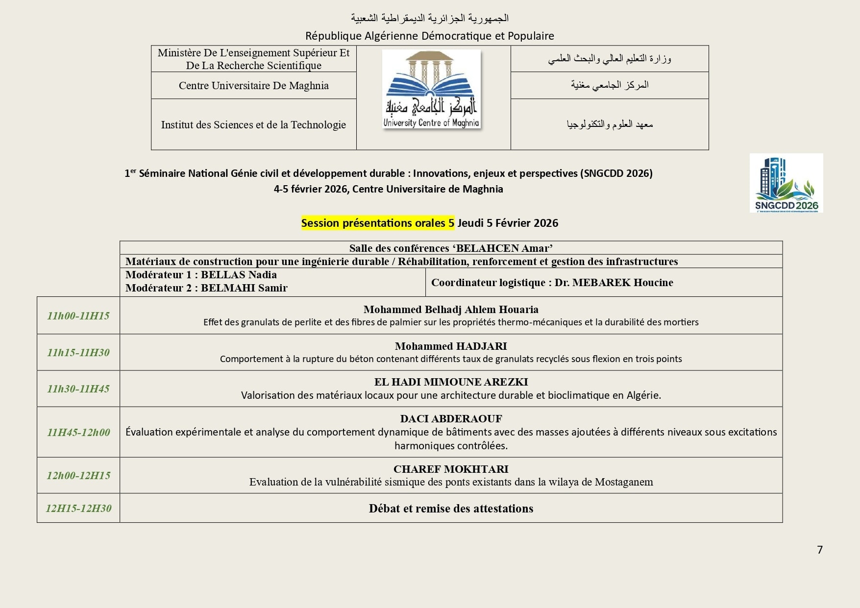 ملتقى وطني بعنوان الهندسة المدنية والتنمية المستدامة: ابتكارات، تحديات وآفاق (SNGCDD 2026) ، 4-5 فيفري 2026، المركز الجامعي بمغنية.