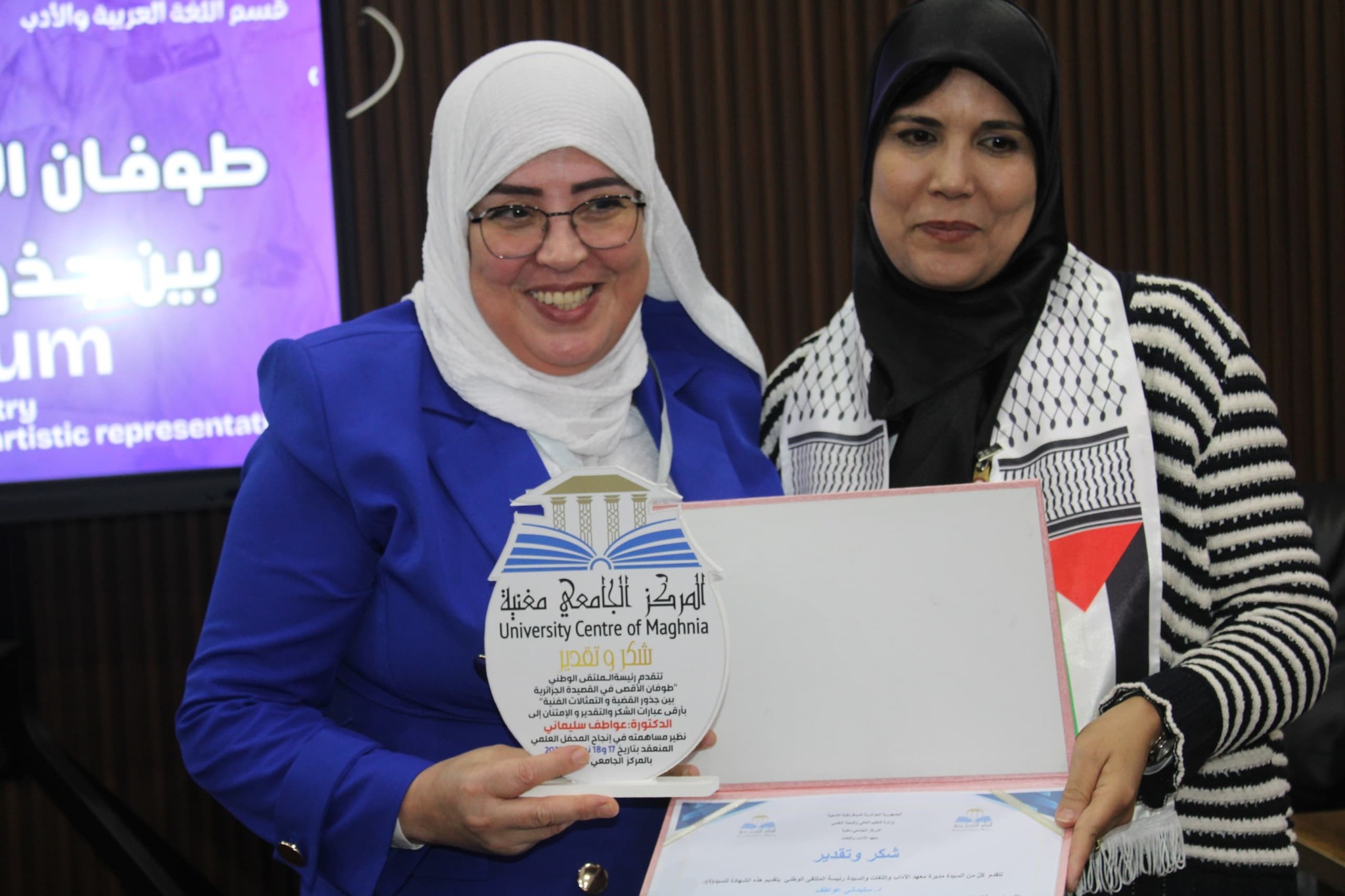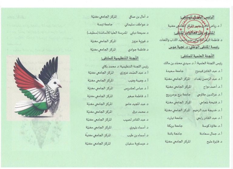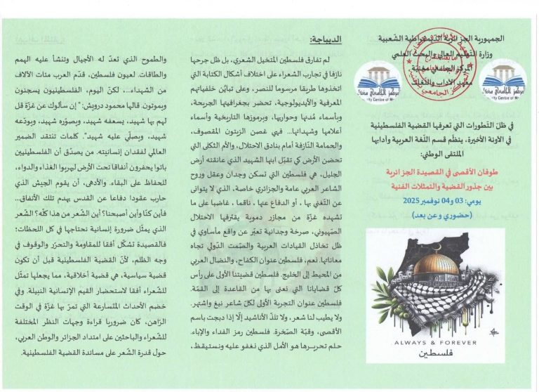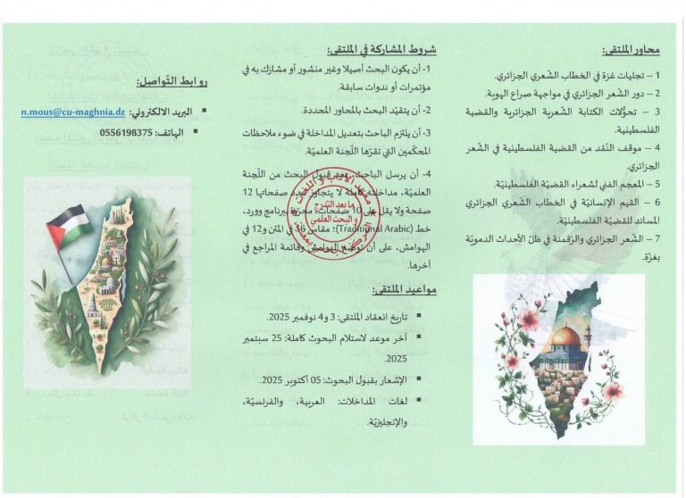 يتشرف معهد الآداب واللغات المركز الجامعي مغنية  بدعوتكم للمشاركة في الملتقى الوطني المعنون”طوفان الأقصى في القصيدة الجزائرية بين جذور القضية والتمثلات الفنية” والذي سينظمه معهد الآداب واللغات بالمركز الجامعي مغنية بتاريخ 03 و04 نوفمبر 2025 والذي سيكون حضوريا وعن بعد، حضوركم شرف لنا.