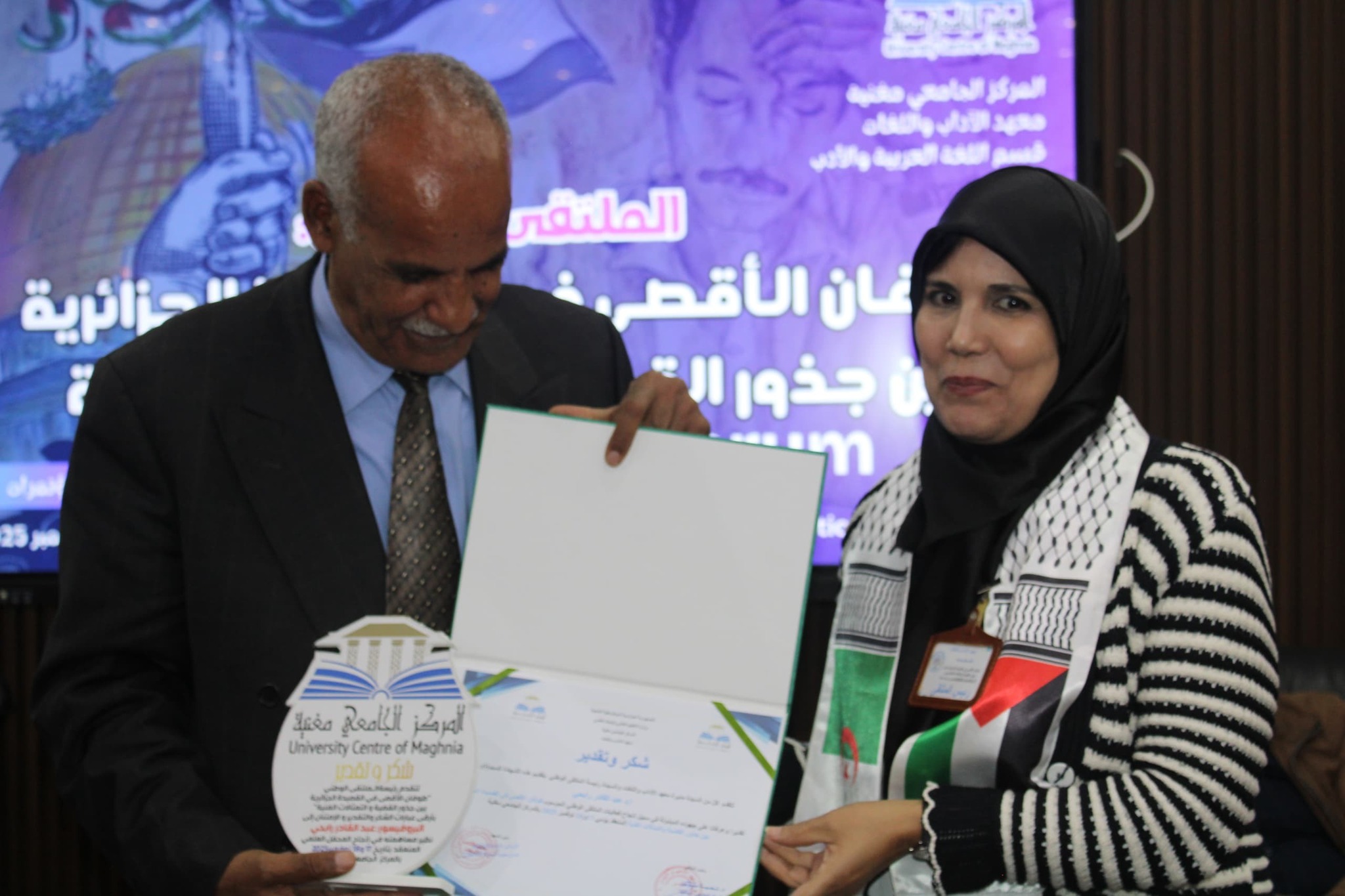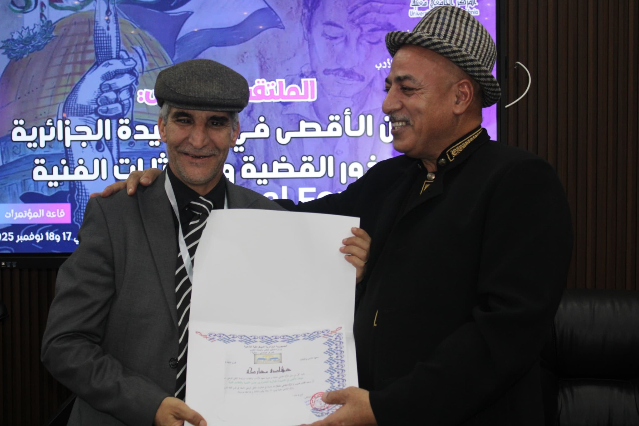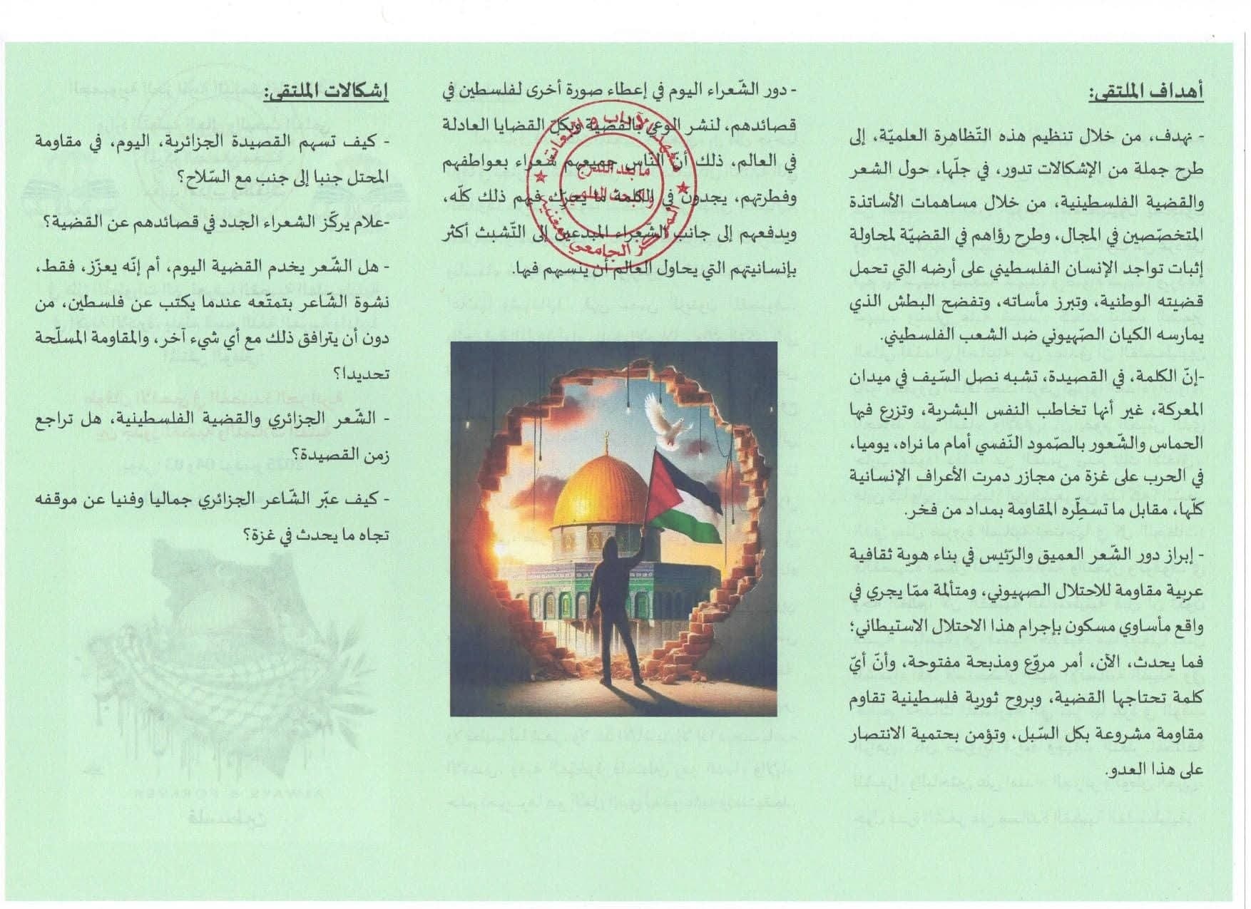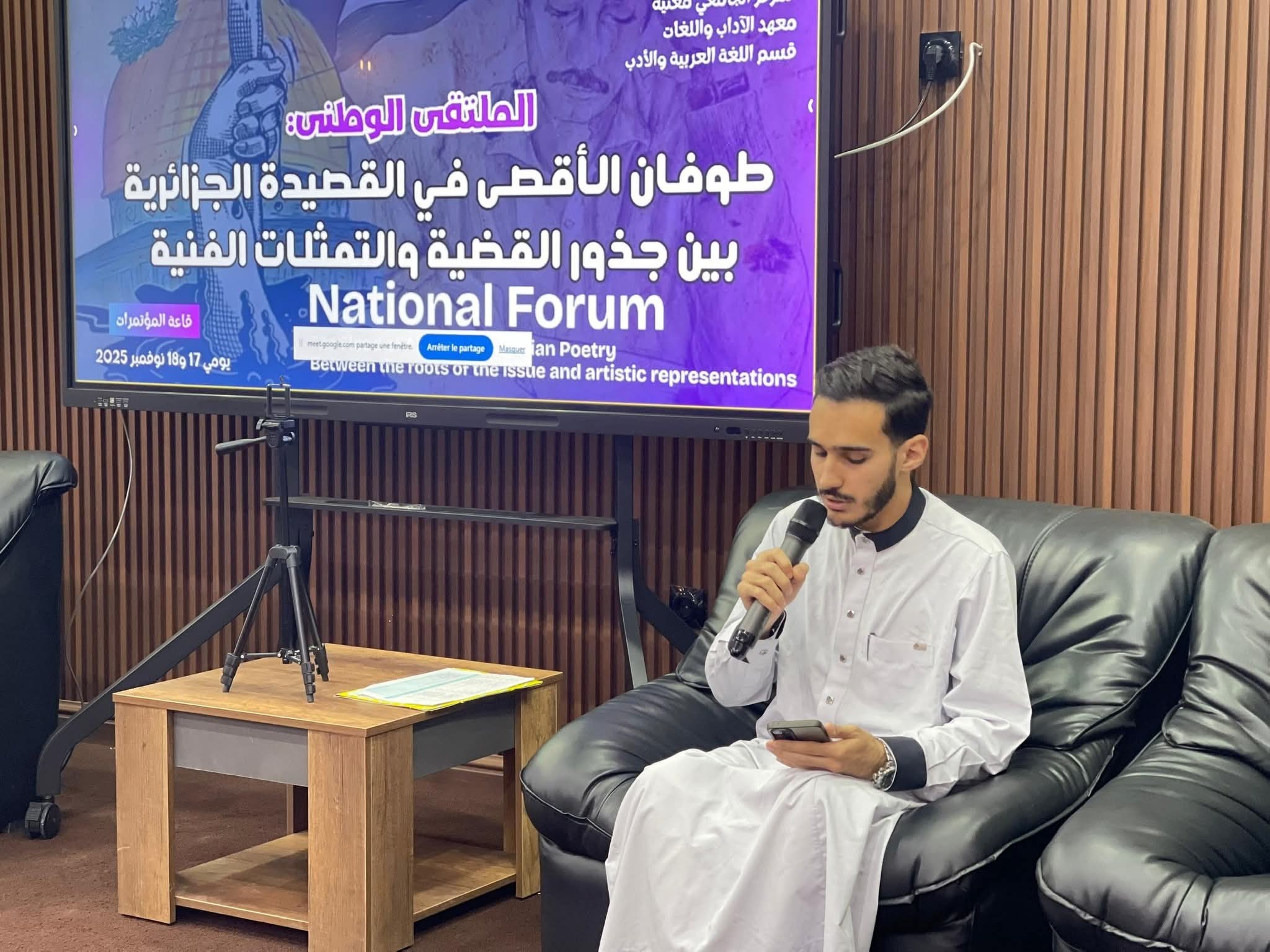 – وقد شهد هذا اليوم حضورًا مميزًا لأساتذة وباحثين وطلبة، قدّموا مداخلات علمية قيّمة تناولت حضور القضية الفلسطينية في الوجدان الشعري الجزائري، وأبعادها الفنية والجمالية، إضافة إلى قراءة نقدية في أهم النماذج الشعرية التي لامست طوفان الأقصى بروح التضامن والمقاومة.