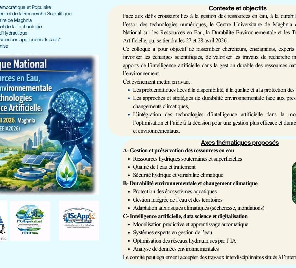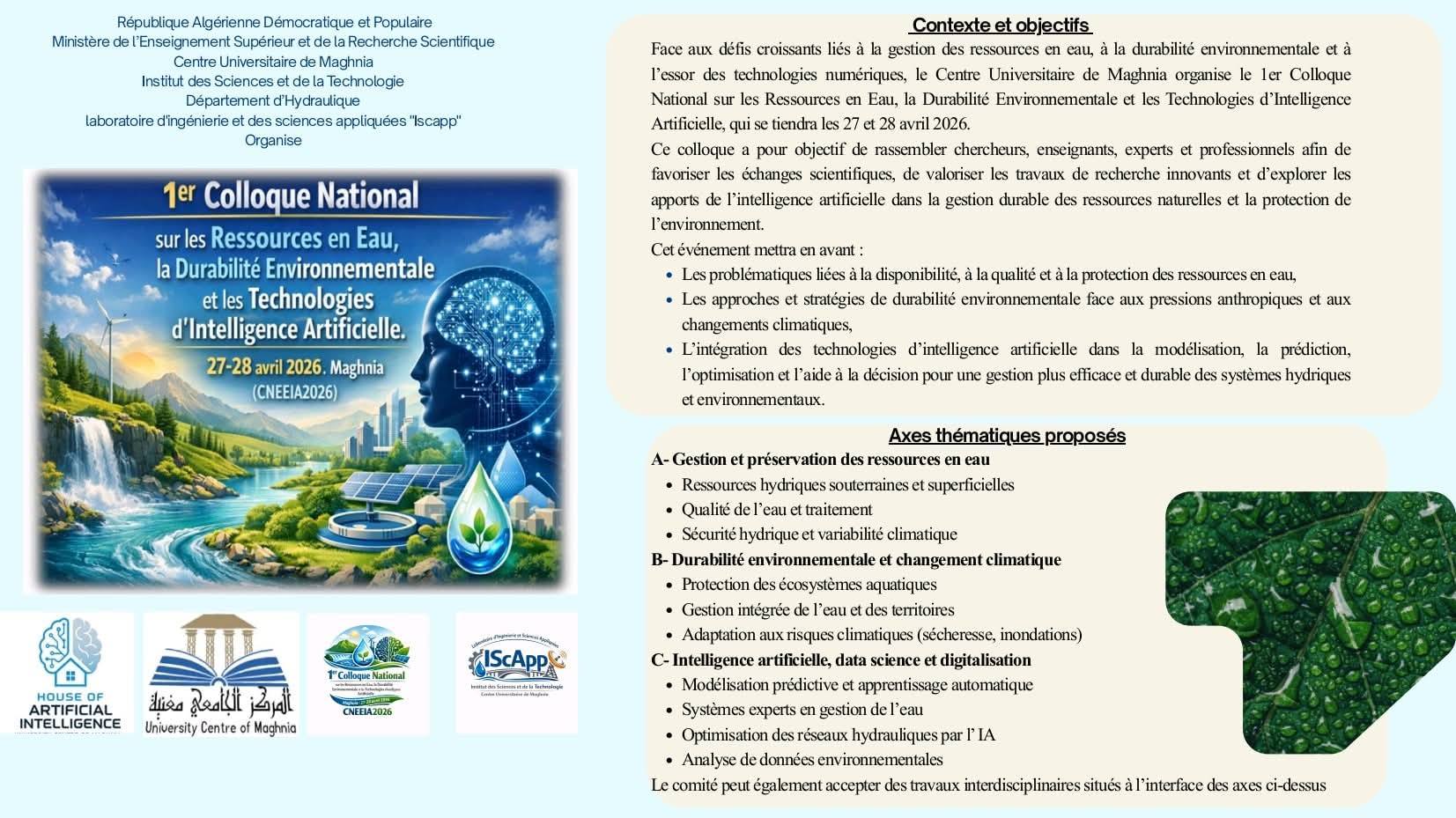 ملتقى وطني : الموارد المائية، الاستدامة البيئية وتقنيات الذكاء الاصطناعي (CNEEIA 2026)