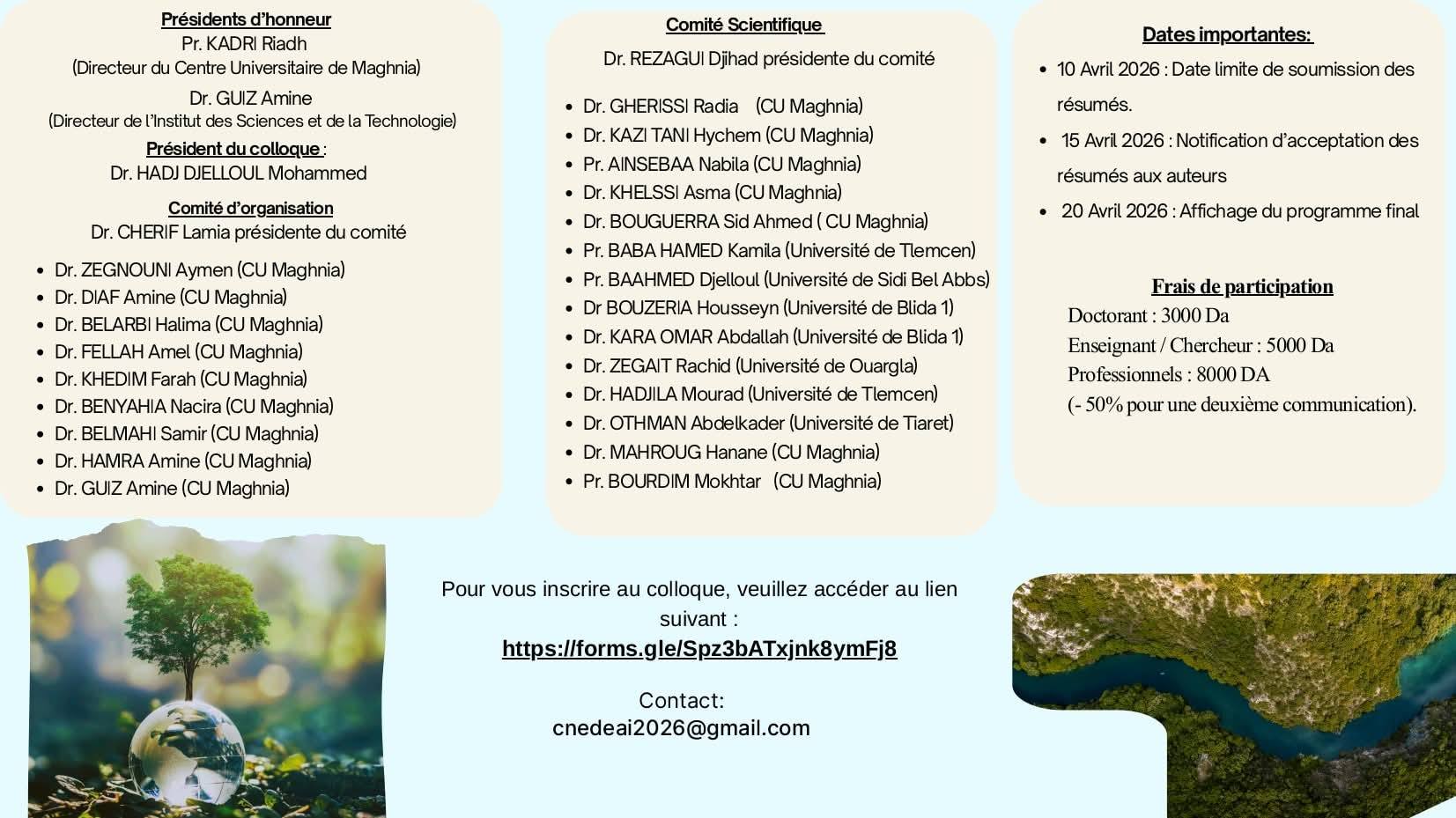 يسر المركز الجامعي مغنية، من خلال معهد العلوم والتكنولوجيا وقسم الري، الإعلان عن تنظيم: الملتقى الوطني الأول حول الموارد المائية، الاستدامة البيئية وتقنيات الذكاء الاصطناعي (CNEEIA 2026)