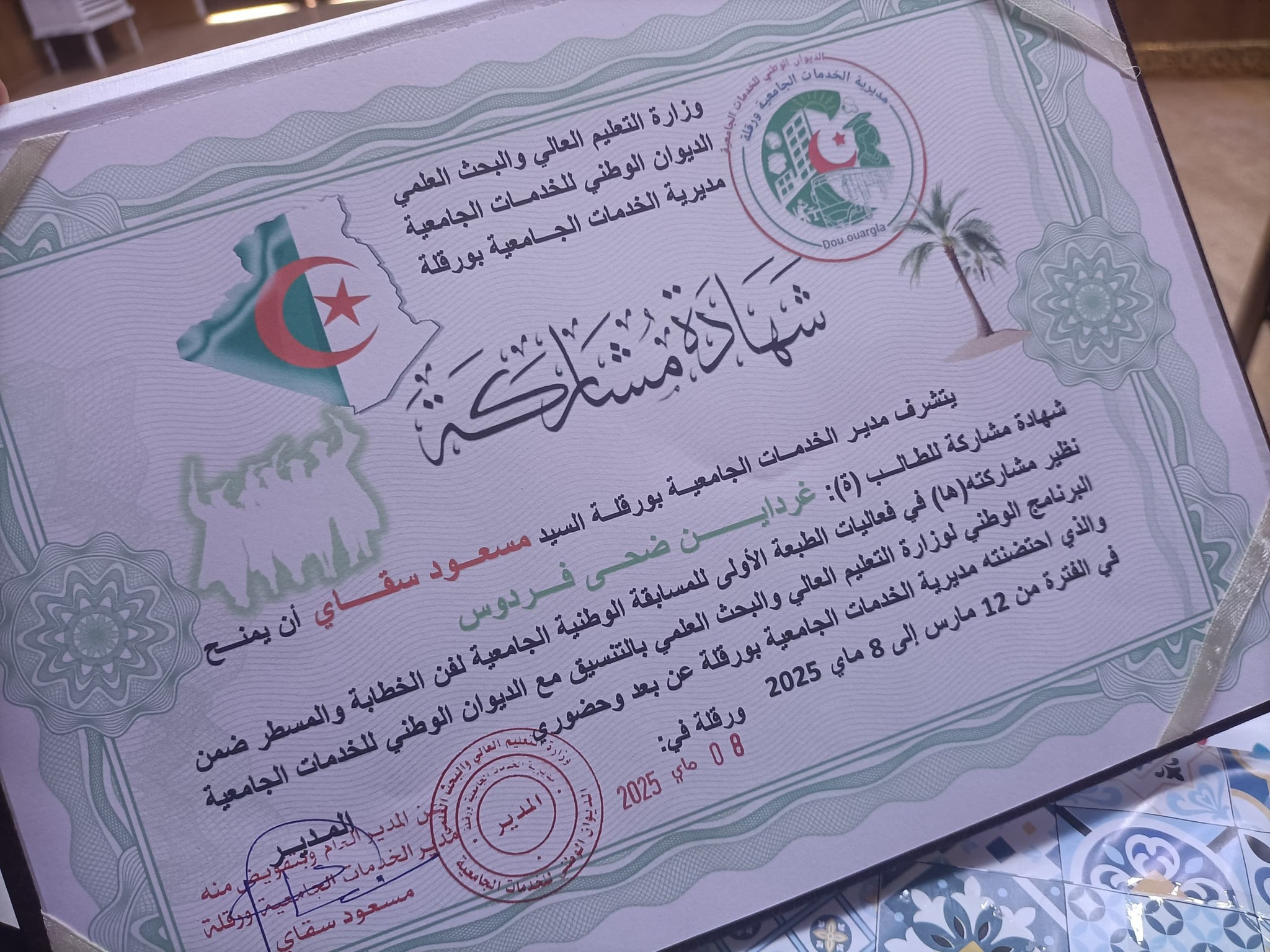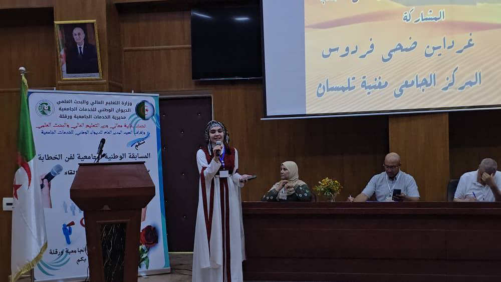 والتي عرفت مشاركة المتألقة “غرداين ضحى فردوس ” ممثلة المركز الجامعي مغنية University Centre of Maghnia والمتأهلة لنهائيات المسابقة ؛ والتي تحصلت على المرتبة الخامسة وطنيا ؛مبروك الانجاز ؛ ومزيدا من التألق و النجاح في الاستحقاقات القادمة.
