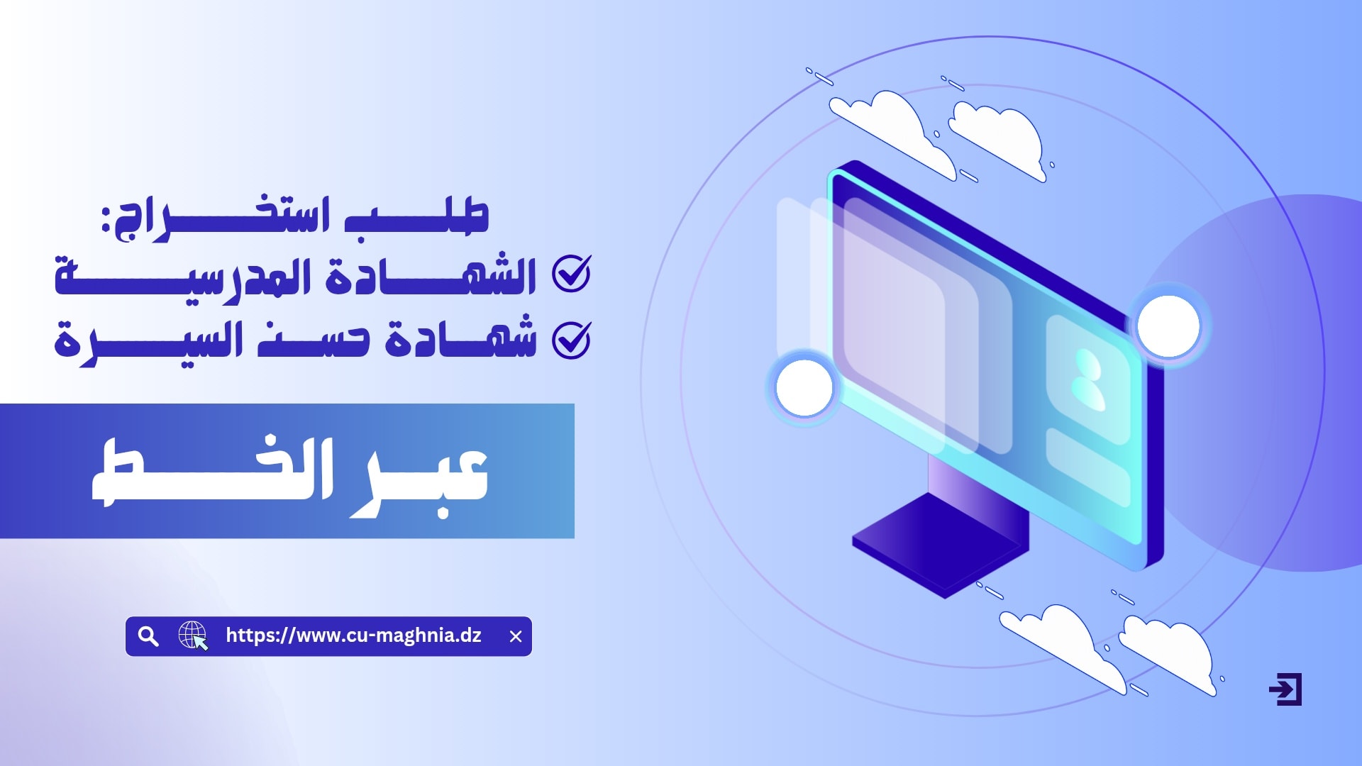 يمكن لطلبة المركز الجامعي مغنية تقديم طلب استخراج شهادة مدرسية و/أو شهادة الوضعية أمام المجلس التأديبي، عبر الخط، حسب كل معهد، عبر الروابط الإلكترونية التالية: