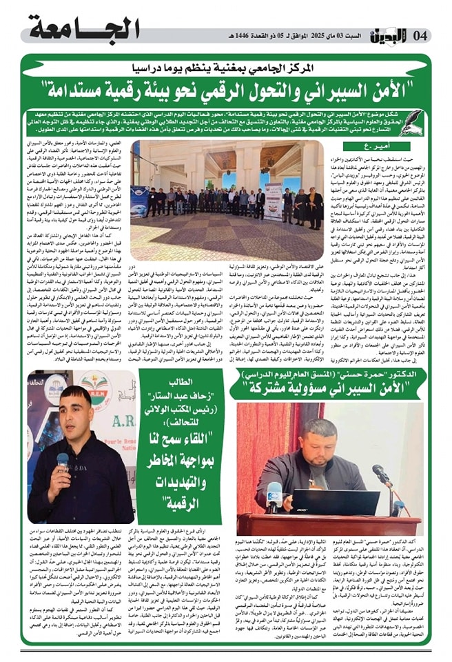 مقال حول اليوم الدراسي المنظم يوم الأربعاء الموافق 23 أفريل 2025 بعنوان: "الأمن السيبراني والتحول الرقمي نحو بيئة رقمية مستدامة"، منشور في جريدة البديل، في عدد السبت الموافق 03 ماي 2025.