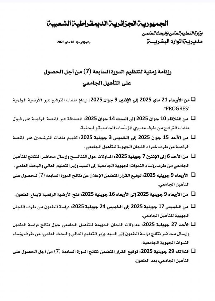 الرزنامة الزمنية لتنظيم الدورة السابعة (7) من أجل الحصول على التأهيل الجامعي