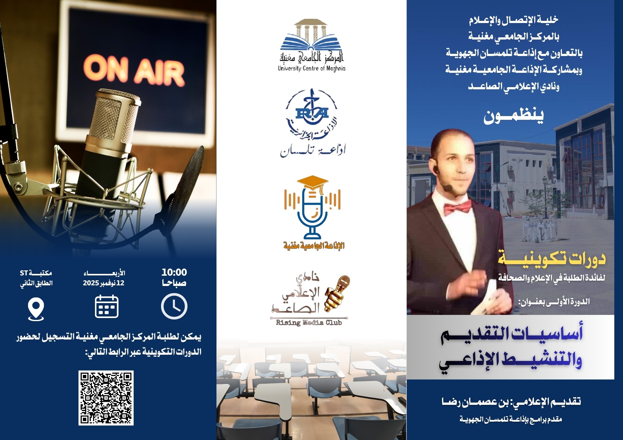 ينظم المركز الجامعي مغنية بالتعاون مع إذاعة تلمسان الجهوية و بمشاركة الإذاعة الجامعية مغنية ونادي الإعلامي الصاعد دورة تكوينية تحت عنوان أساسيات التقديم و التنشيط الإذاعي من تقديم مذيع إذاعة تلمسان الجهوي الصحفي رضا بن عصمان و ذلك يوم الأربعاء