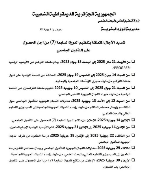 تمديد الآجال المتعلقة بتنظيم الدورة السابعة (7) من أجل الحصول على التأهيل الجامعي