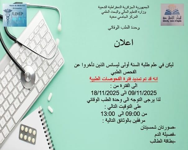 إعلان هام وحدة الطب الوقائي المركز الجامعي مغنية University Centre of Maghnia