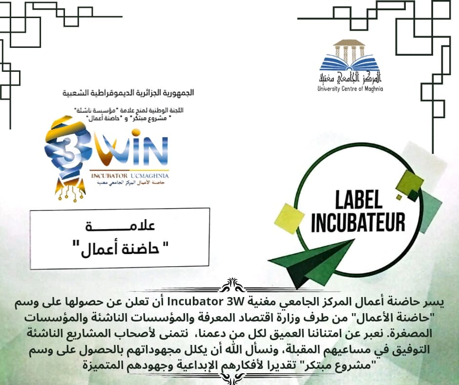 يسر حاضنة أعمال المركز الجامعي مغنية 3W Incubator أن تعلن عن حصولها على وسم “حاضنة الأعمال” LABEL من طرف وزارة اقتصاد المعرفة والمؤسسات الناشئة والمؤسسات المصغرة.