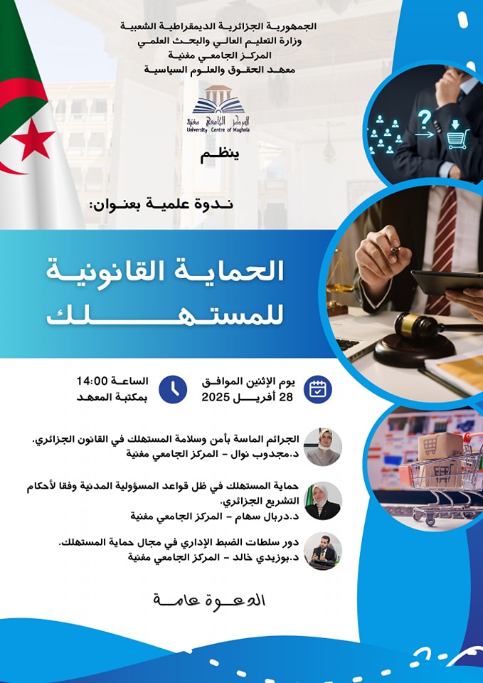 يتشرف معهد الحقوق والعلوم السياسية بالمركز الجامعي مغنية دعوة الأساتذة والباحثين والطلبة لحضور فعالية الندوة العلمية بعنوان: الحماية القانونية للمستهلك. يوم الإثنين الموافق 28 أفريل 2025، الساعة 14:00 بمكتبة معهد الحقوق والعلوم السياسية. الدعوة عامة مرحباً بالجميع