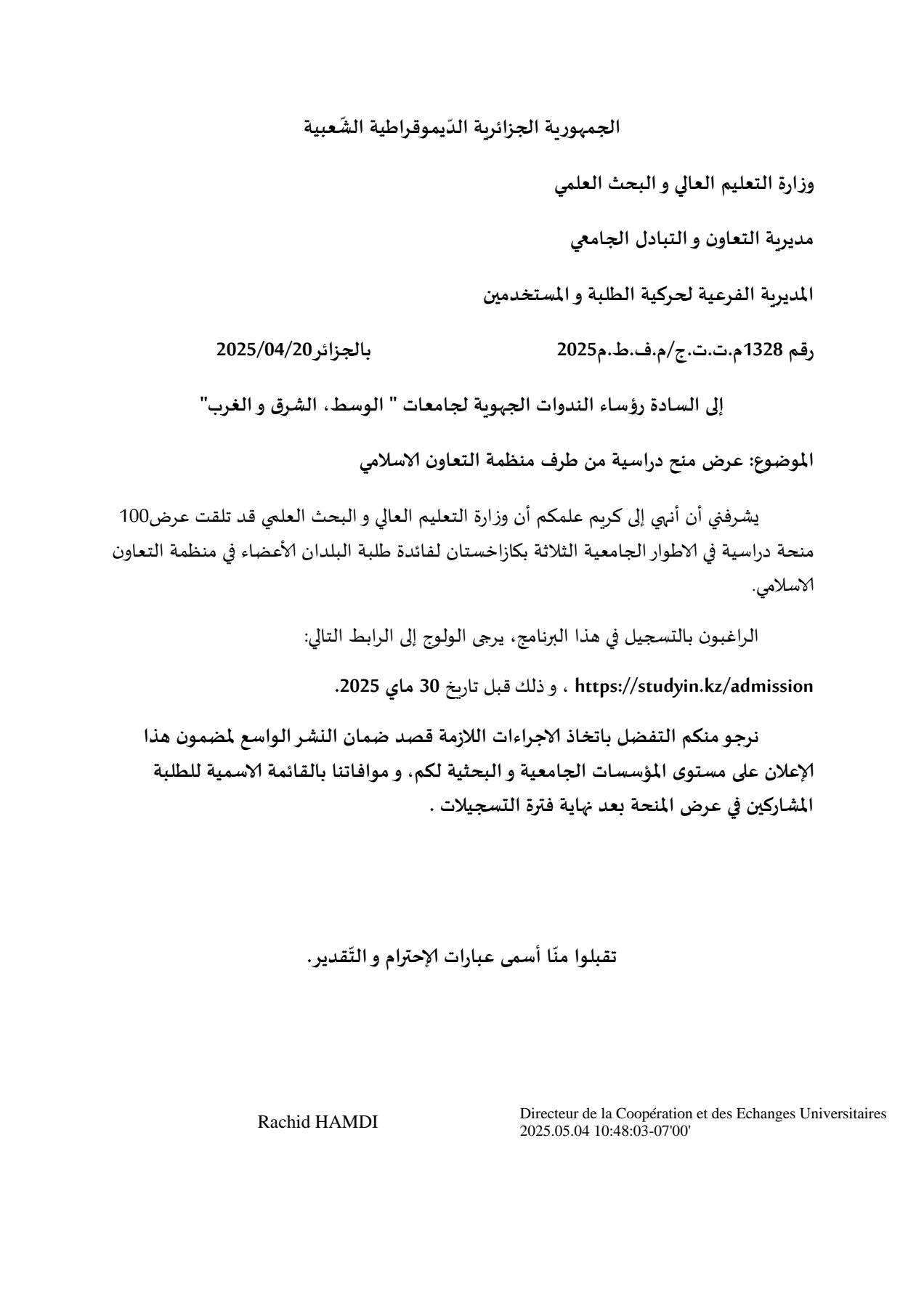 5 مايو 2025 05 ماي 2025 عرض 100 منحة دراسية في الاطوار الجامعية الثلاثة بكازاخستان لطلبة البلدان الاعضاء منظمة التعاون الدولي الاسلامي التسجيل عبر الرابط التالي: https://studyin.kz/admission