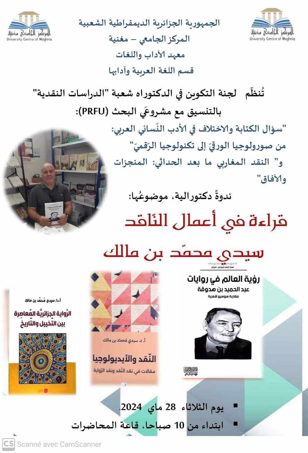 ندوةً دكتورالية، موضوعها: قراءة في أعمال الناقد سيدي محمد بن مالك.