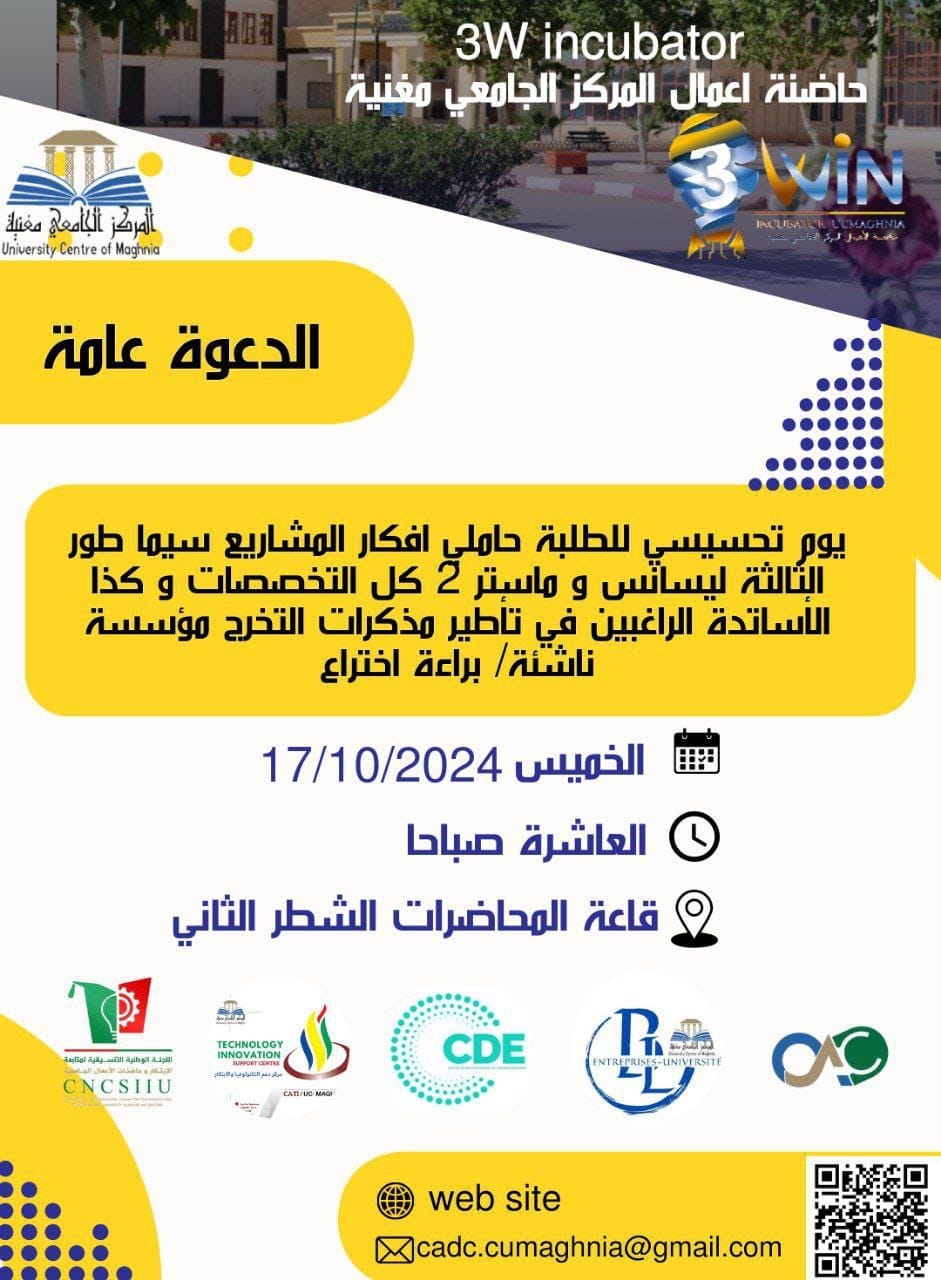 تم في يوم الخميس الموافق 17 أكتوبر 2024 تنظيم يوم تحسيسي بالمركز الجامعي مغنية، خصص لمناقشة القرار 1275 المتعلق بمذكرة التخرج “مؤسسة ناشئة” و”مذكرة تخرج براءة اختراع”. تناول الحدث منهجية إعداد هذه المذكرات وأهم الخطوات لتحقيق النجاح في هذا المجال، مع تسليط الضوء على أهمية الواجهات الجامعية المختلفة.