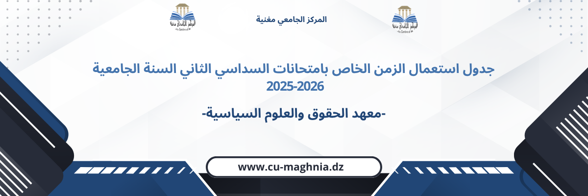 اقرأ المزيد ...تعلن إدارة المركز الجامعي عن صدور رزنامة امتحانات السداسي الثاني (2025-2026)- معهد العلوم الإنسانية والإجتماعية. يُرجى من كافة الطلبة الاطلاع على التوقيت والقاعات المحددة