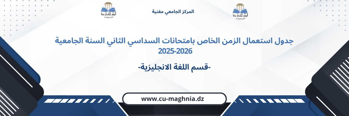 اقرأ المزيد ...تعلن إدارة المركز الجامعي عن صدور رزنامة امتحانات السداسي الثاني (2025-2026)- قسم اللغة الانجليزية. يُرجى من كافة الطلبة الاطلاع على التوقيت والقاعات المحددة