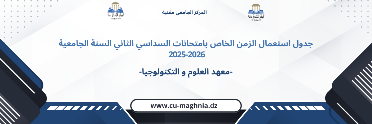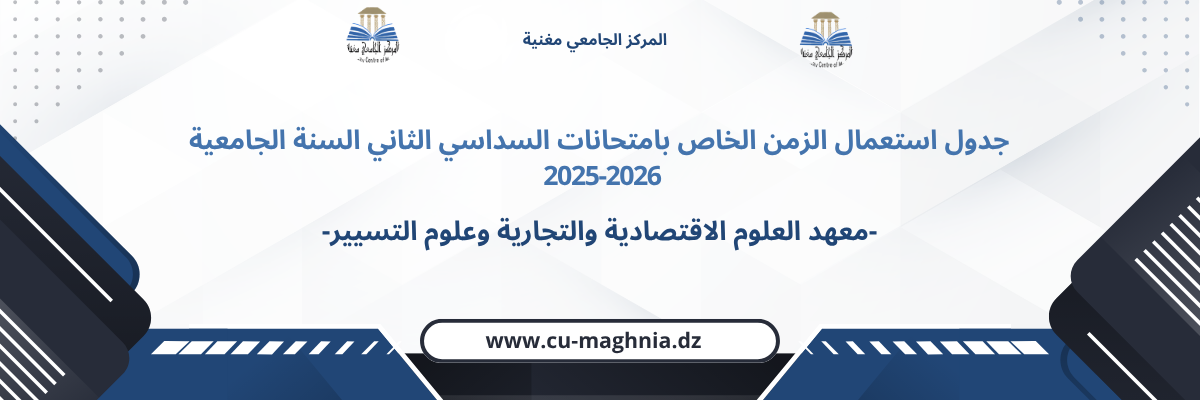 اقرأ المزيد ...تعلن إدارة المركز الجامعي عن صدور رزنامة امتحانات السداسي الثاني (2025-2026)- معهد العلوم الاقتصادية والتجارية وعلوم التسيير. يُرجى من كافة الطلبة الاطلاع على التوقيت والقاعات المحددة