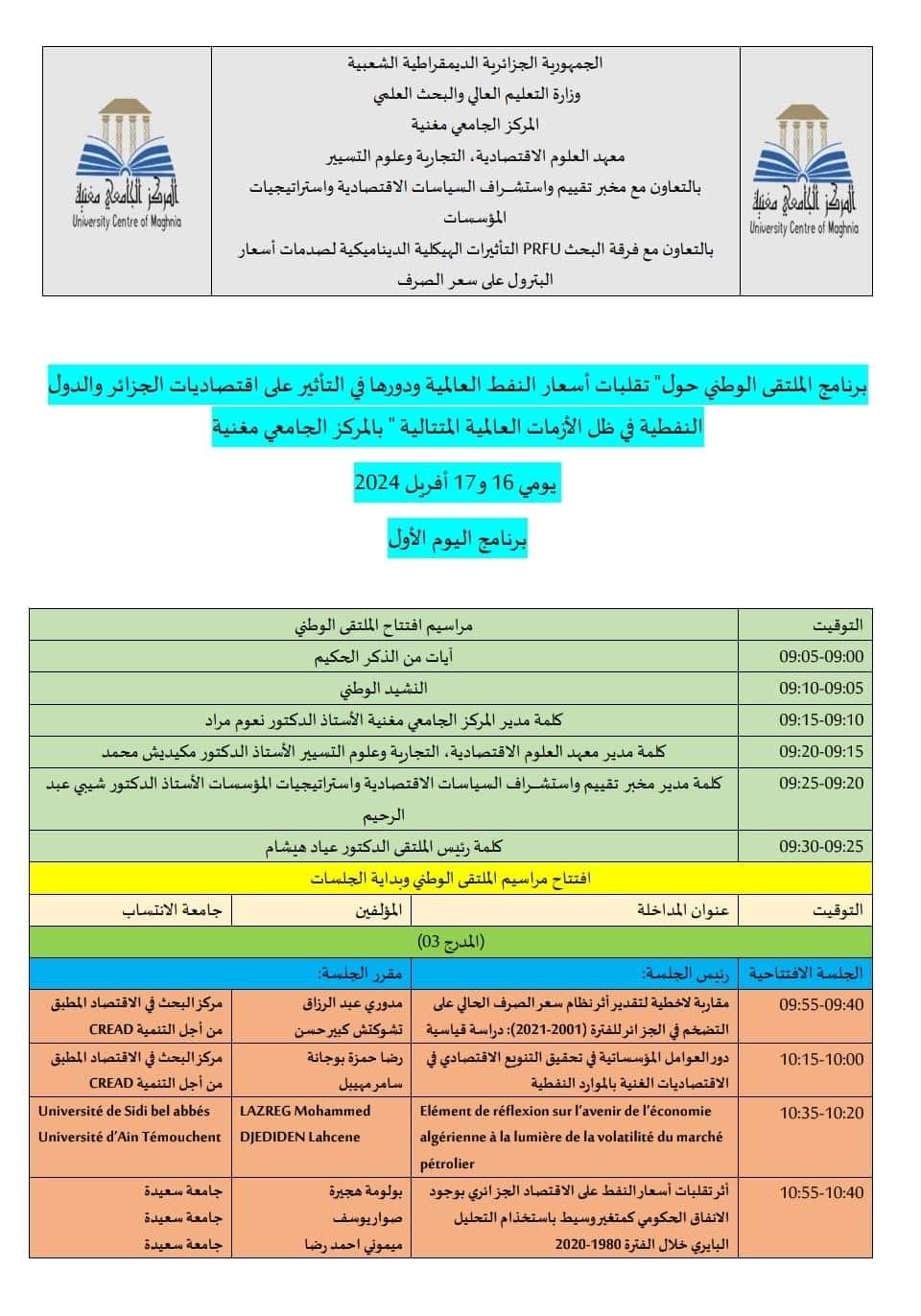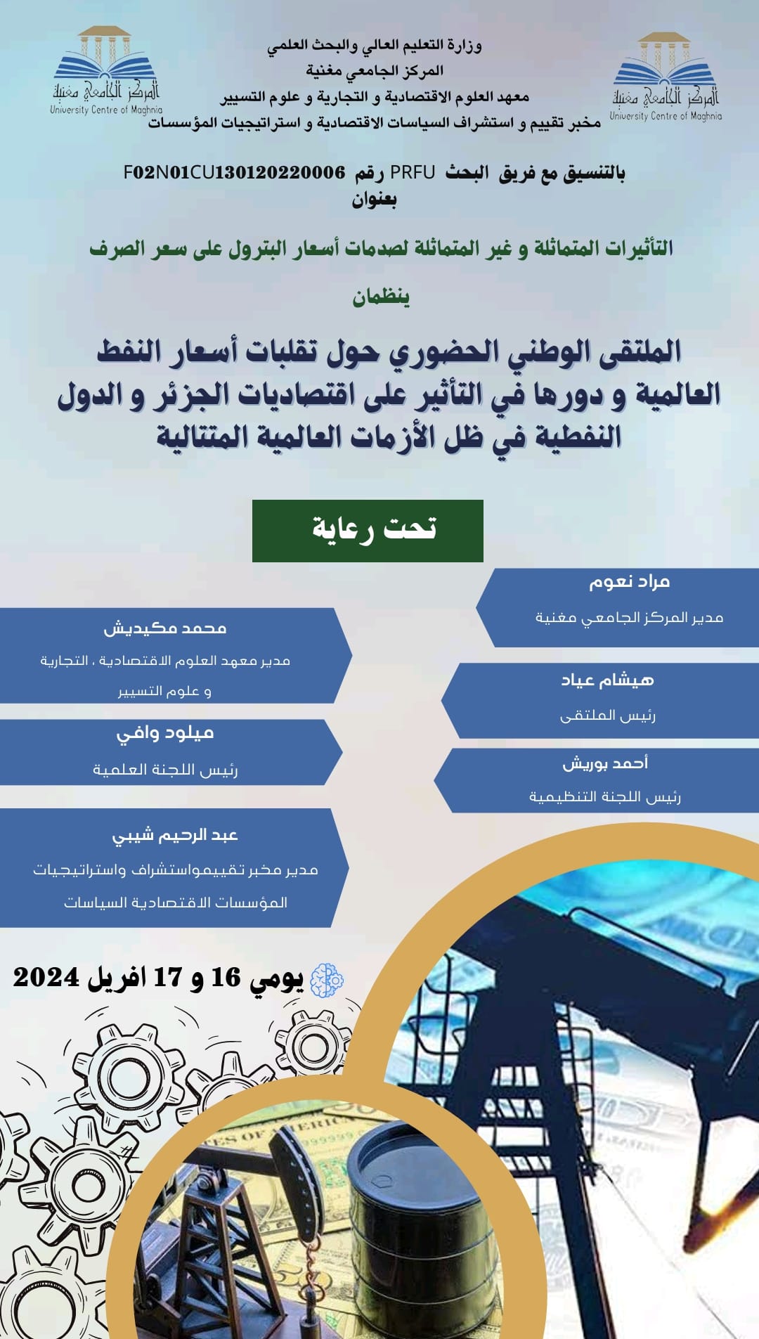 يسر معهد العلوم الاقتصادية والتجارية وعلوم التسيير -المركز الجامعي بمغنية دعوتكم لحضور فعاليات الملتقى الوطني بعنوان: "تقلبات أسعار النفط العالمية ودورها في التأثير على اقتصاديات الجزائر والدول النفطية في ظل الأزمات العالمية المتتالية"، المزمع تنظيمه يومي 16 و17 أفريل 2024 بمدرج المرحوم باعزيز أحمد الشطر الثاني.