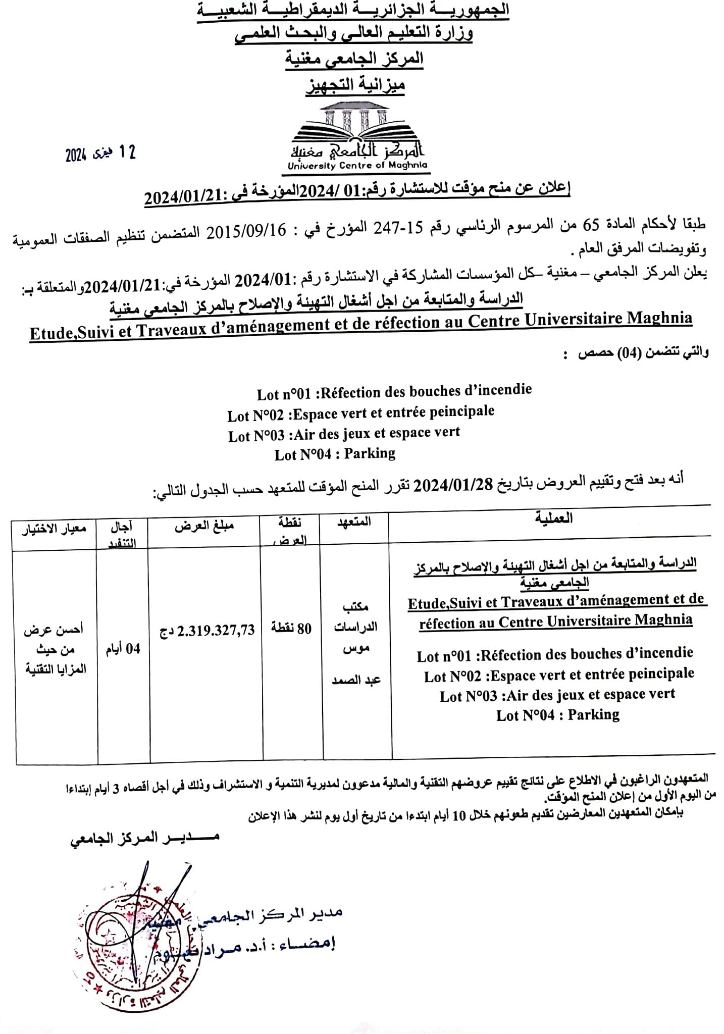 إعلان عن منح مؤقت للاستشارة رقم 2024/01