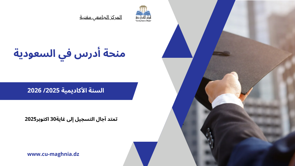 تعلن إدارة المركز الجامعي مغنية عن تمديد آجال التسجيل في برنامج المنح الدراسية المجانية طويلة المدى (ماستر ودكتوراه) في إطار مبادرة “أدرس في السعودية” إلى غاية 30 أكتوبر 2025.