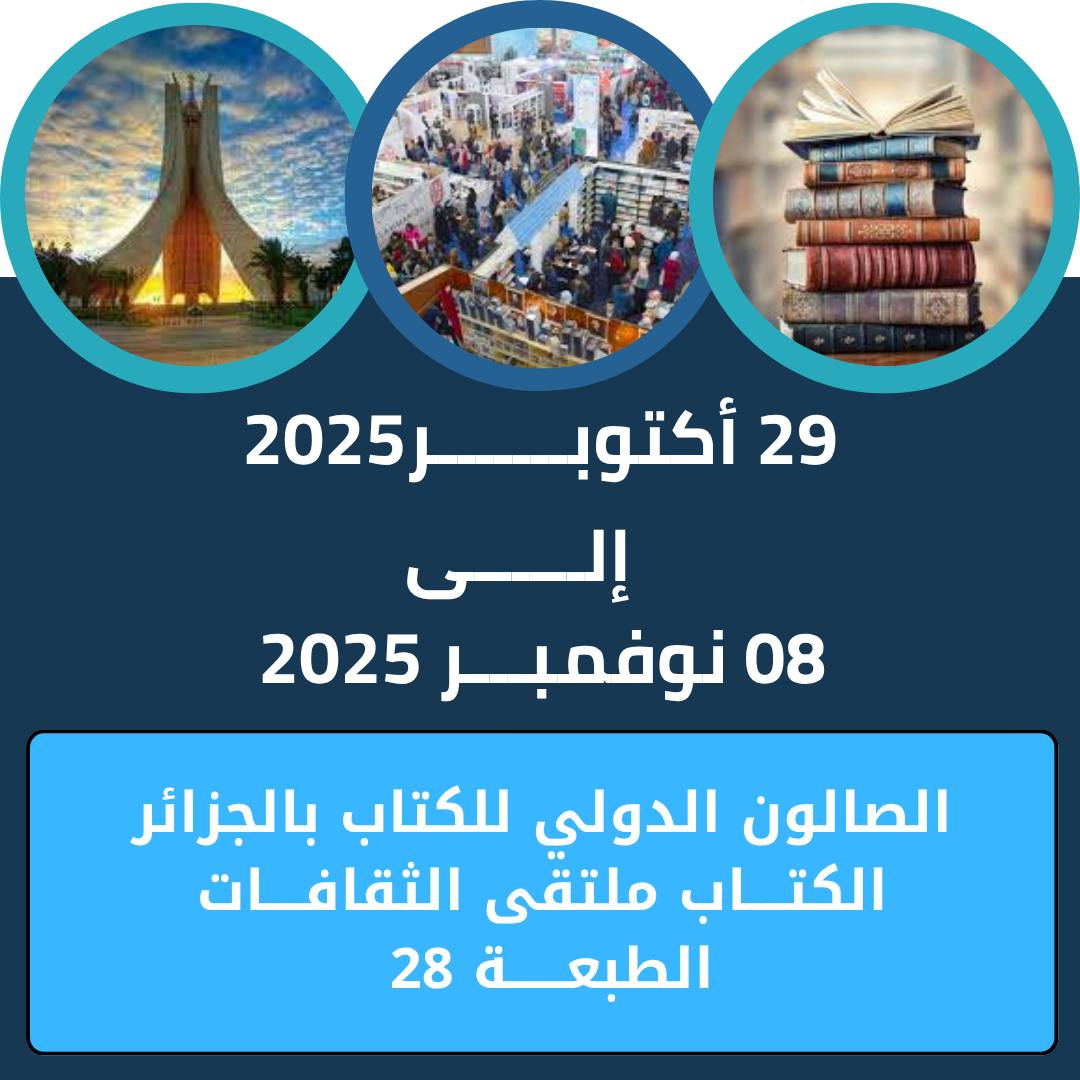 تحت الرعاية السامية لرئيس الجمهورية السيد “عبد المجيد تبون”، ينظم قصر المعارض الصنوبر البحري من 29 أكتوبر2025 الى 08 نوفمبر 2025 صالون الجزائر الدولي للكتاب في طبعته 28 تحت شعار الكتاب ملتقى الثقافات .