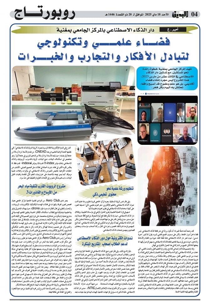 مقال منشور بجريدة البديل اليومية الصادرة يوم الأحد الموافق 18 ماي 2025 يسلط الضوء على دار الذكاء الاصطناعي بالمركز الجامعي مغنية، فضاء رقمي لتبادل الأفكار والتجارب والخبرات.