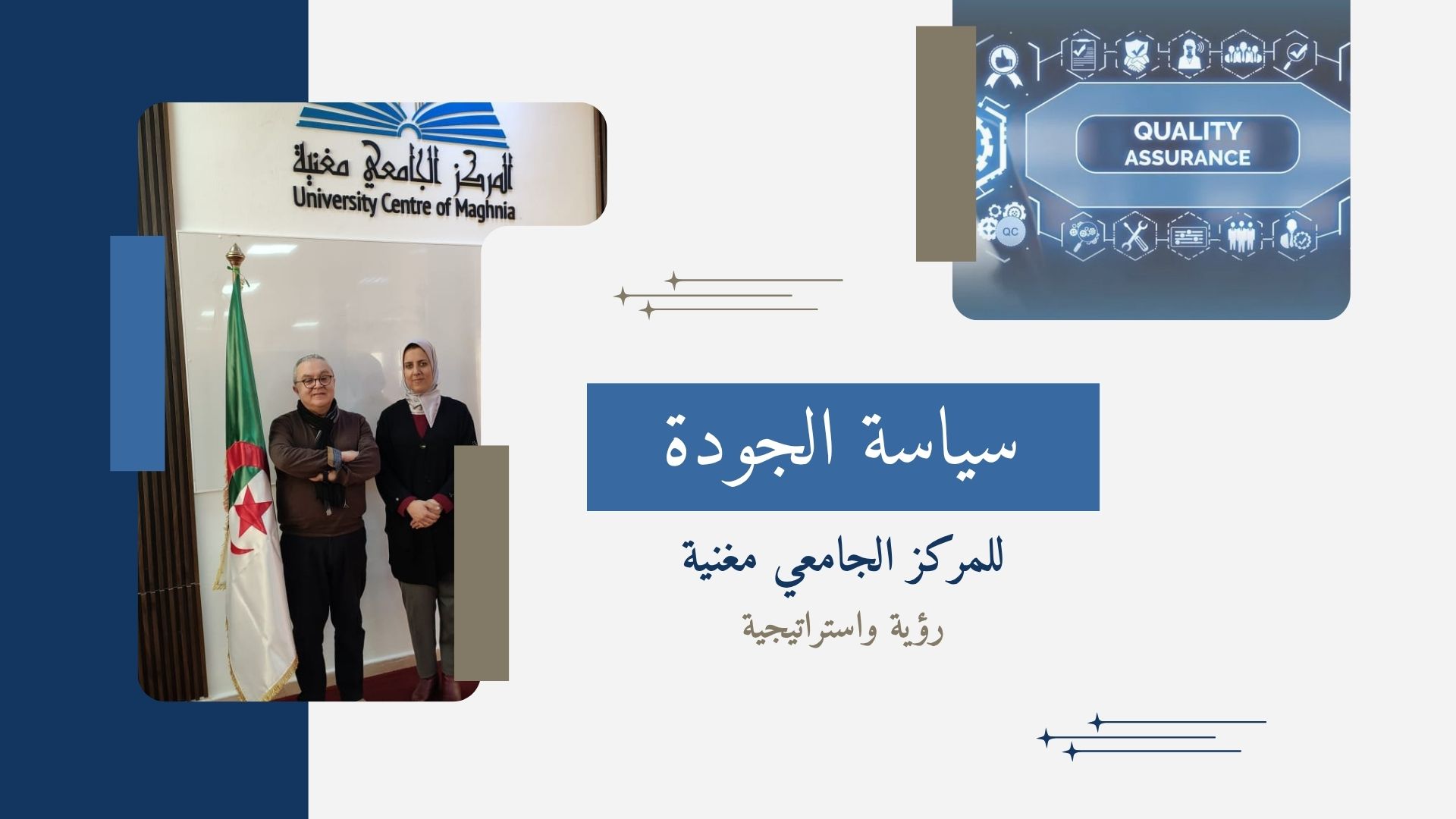 Read more...Maghnia University Centre officially announces the adoption of its Quality Policy, as part of its commitment to establishing a culture of quality and continuous improvement. This initiative aims to enhance administrative and pedagogical performance by implementing a Quality Management System in accordance with the international standard ISO 9001:2015, ensuring the elevation of the quality of services provided.